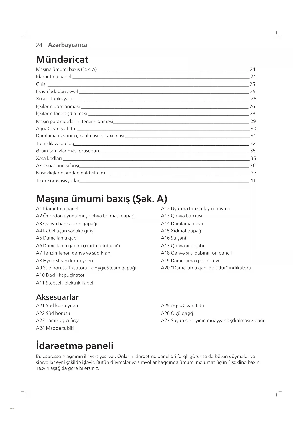 Azərbaycanca Mündəricat Maşına ümumi baxış (Şək. A) _______________________________________________________________ 24 İdarəetmə paneli__________________________________________________________________________ 24 Giriş ____________________________________________________________________________________ 25 İlk istifadədən əvvəl _______________________________________________________________________ 25 Xüsusi funksiyalar _________________________________________________________________________ 26 İçkilərin dəmlənməsi ______________________________________________________________________ 26 İçkilərin fərdiləşdirilməsi ___________________________________________________________________ 28 Maşın parametrlərini tənzimlənməsi_________________________________________________________ 29 AquaClean su filtri ________________________________________________________________________ 30 Dəmləmə dəstinin çıxarılması və taxılması ____________________________________________________ 31 Təmizlik və qulluq_________________________________________________________________________ 32 Ərpin təmizlənməsi proseduru______________________________________________________________ 35 Xəta kodları ______________________________________________________________________________ 35 Aksesuarların sifarişi_______________________________________________________________________ 36 Nasazlıqların aradan qaldırılması ____________________________________________________________ 37 Texniki xüsusiyyətlər_______________________________________________________________________ 41 Maşına ümumi baxış (Şək. A) A1 İdarəetmə paneli A2 Öncədən üyüdülmüş qəhvə bölməsi qapağı A3 Qəhvə bankasının qapağı A4 Kabel üçün şəbəkə girişi A5 Damcılama qabı A6 Damcılama qabını çıxartma tutacağı A7 Tənzimlənən qəhvə və süd kranı A8 HygieSteam konteyneri A9 Süd borusu fiksatoru ilə HygieSteam qapağı A10 Daxili kapuçinator A11 Ştepselli elektrik kabeli A12 Üyütmə tənzimləyici düymə A13 Qəhvə bankası A14 Dəmləmə dəsti A15 Xidmət qapağı A16 Su çəni A17 Qəhvə xıltı qabı A18 Qəhvə xıltı qabının ön paneli A19 Damcılama qabı örtüyü A20 “Damcılama qabı doludur” indikatoru Aksesuarlar A21 Süd konteyneri A22 Süd borusu A23 Təmizləyici fırça A24 Maddə tübiki A25 AquaClean filtri A26 Ölçü qaşığı A27 Suyun sərtliyinin müəyyənləşdirilməsi zolağı İdarəetmə paneli Bu espresso maşınının iki versiyası var. Onların idarəetmə panelləri fərqli görünsə də bütün düymələr və simvollar eyni şəkildə işləyir. Bütün düymələr və simvollar haqqında ümumi məlumat üçün B şəklinə baxın. Təsviri aşağıda görə bilərsiniz.25 Azərbaycanca Ekranda hərəkət etmək üçün yuxarı və aşağı oxlardan, seçimlərinizi etmək və ya təsdiqləmək üçün isə OK simvolundan istifadə edin. B1 Yandır/söndür düyməsi B2 Bir toxunuşla içki simvolları B3 CoffeeMaestro simvolu B4 Daha çox içki menyusu B5 Başlama/dayandırma düyməsi B6 Naviqasiya simvolları (yuxarı, aşağı, geri, ok) B7 Ekran B8 Maşın parametrləri B9 Təmizləmə menyusu B10 Şəxsi profillər Giriş Saeco tam avtomatik qəhvə maşınını satın aldığınız üçün sizi təbrik edirik! Saeco-nun təklif etdiyi onlayn dəstəkdən tam faydalanmaq üçün www.saeco.com/MyCoffeeMachine ünvanına keçin və məhsulunuzu qeydiyyatdan keçirin. Qeyd: Bu maşın qəhvə ilə sınaqdan keçirilmişdir. Cihaz diqqətlə təmizlənsə belə, bəzi qəhvə qalıqları qala bilər. Bununla belə, maşının tamamilə yeni olduğuna dair zəmanət veririk. İlk istifadədən əvvəl