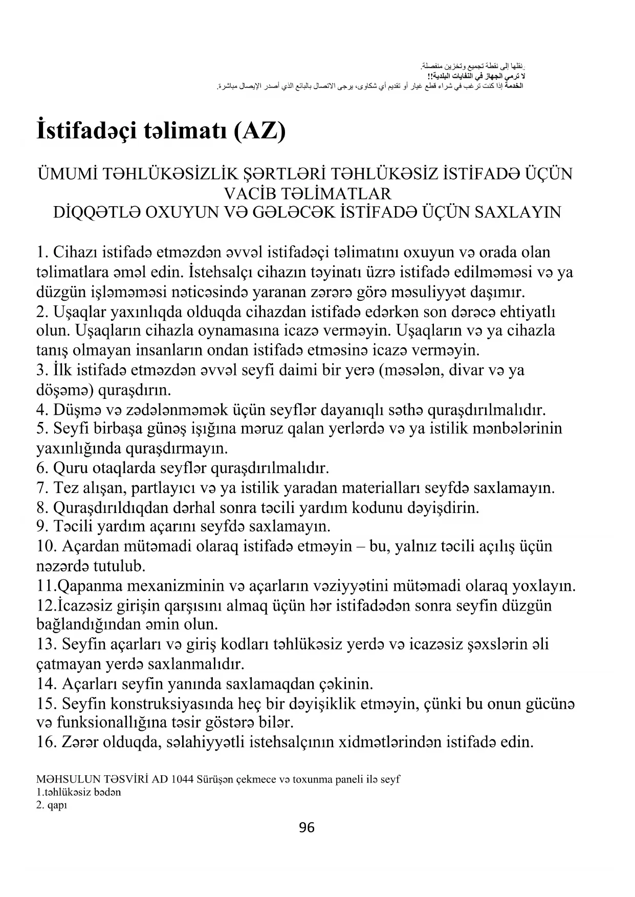 İstifadəçi təlimatı (AZ) ÜMUMİ TƏHLÜKƏSİZLİK ŞƏRTLƏRİ TƏHLÜKƏSİZ İSTİFADƏ ÜÇÜN