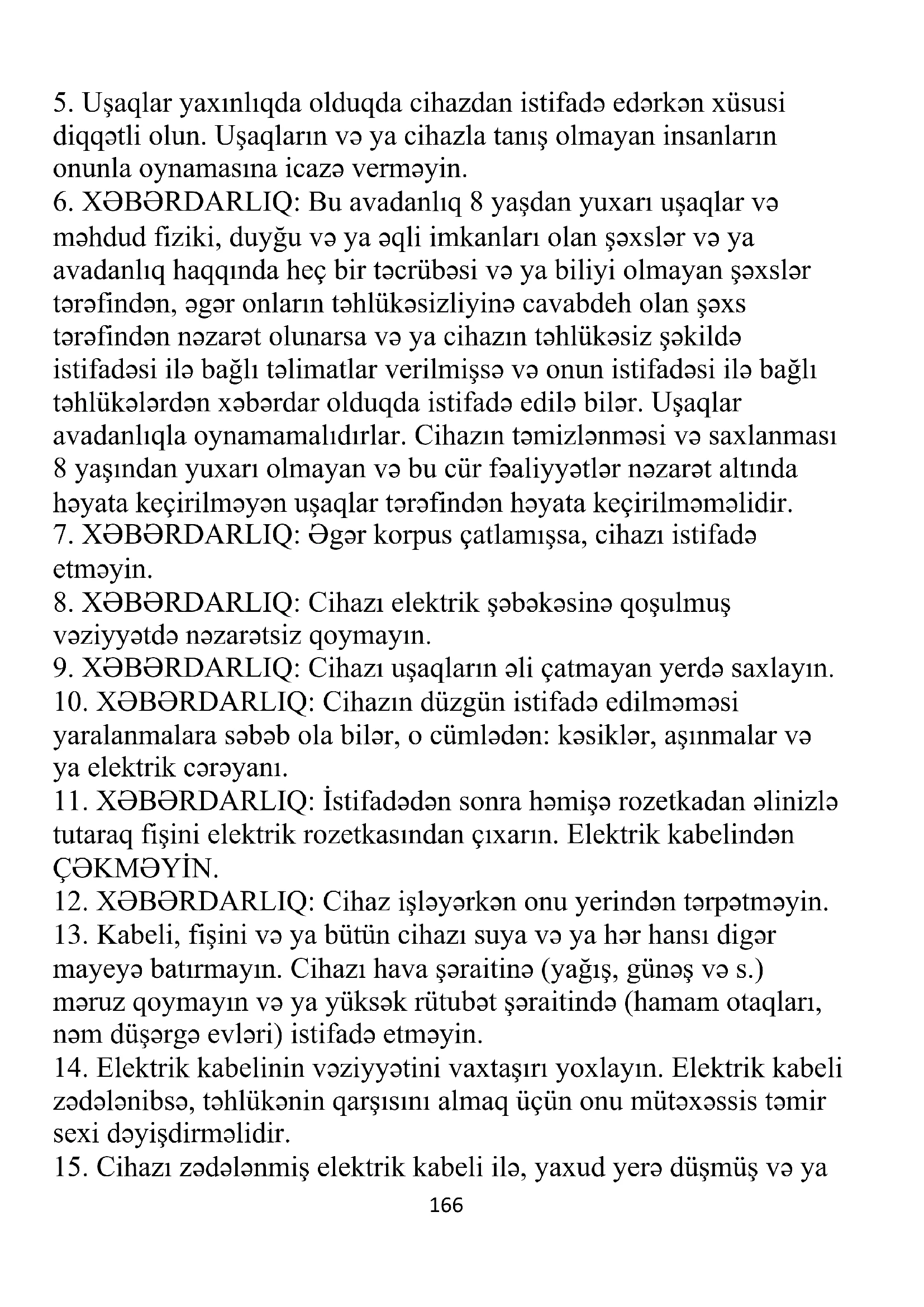 15. Cihazı zədələnmiş elektrik kabeli ilə, yaxud yerə düşmüş və ya167