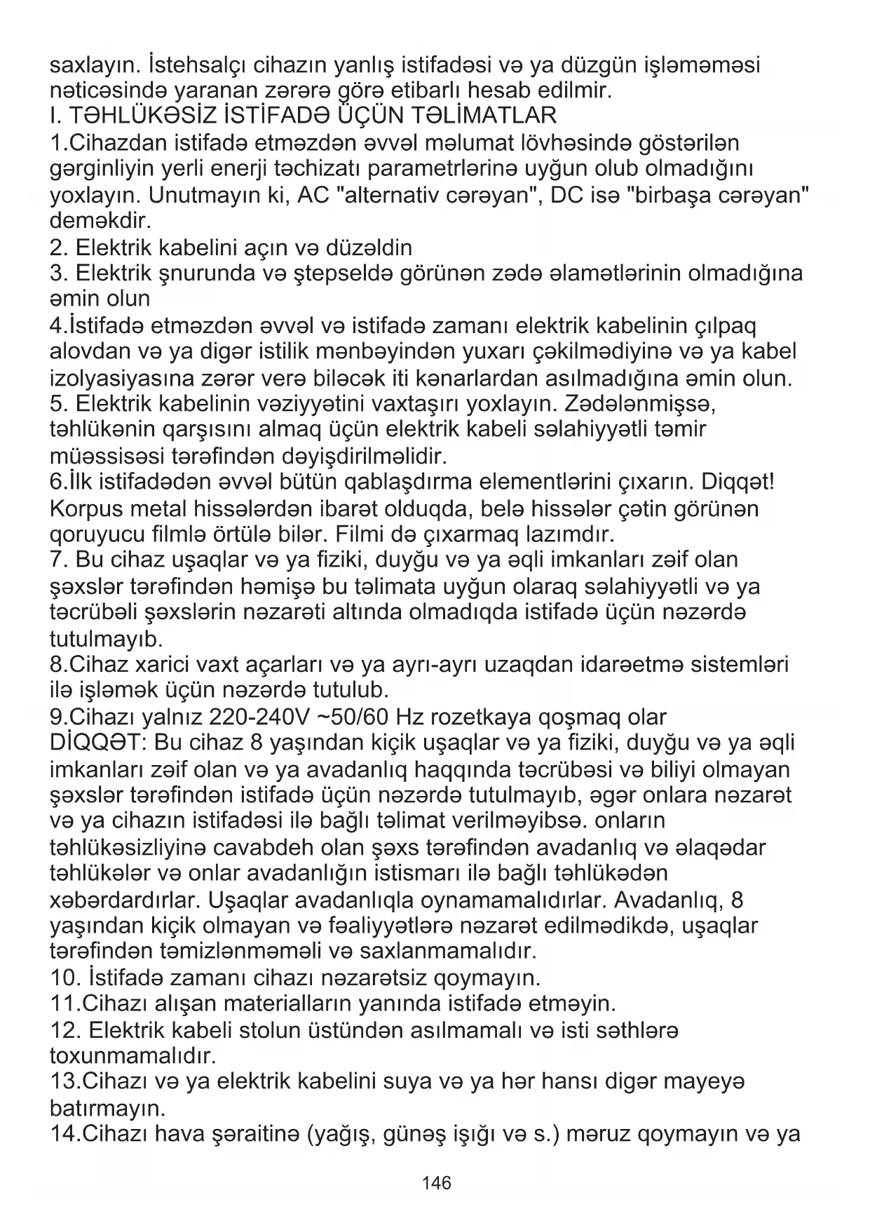 I. TƏHLÜKƏSİZ İSTİFADƏ ÜÇÜN TƏLİMATLAR