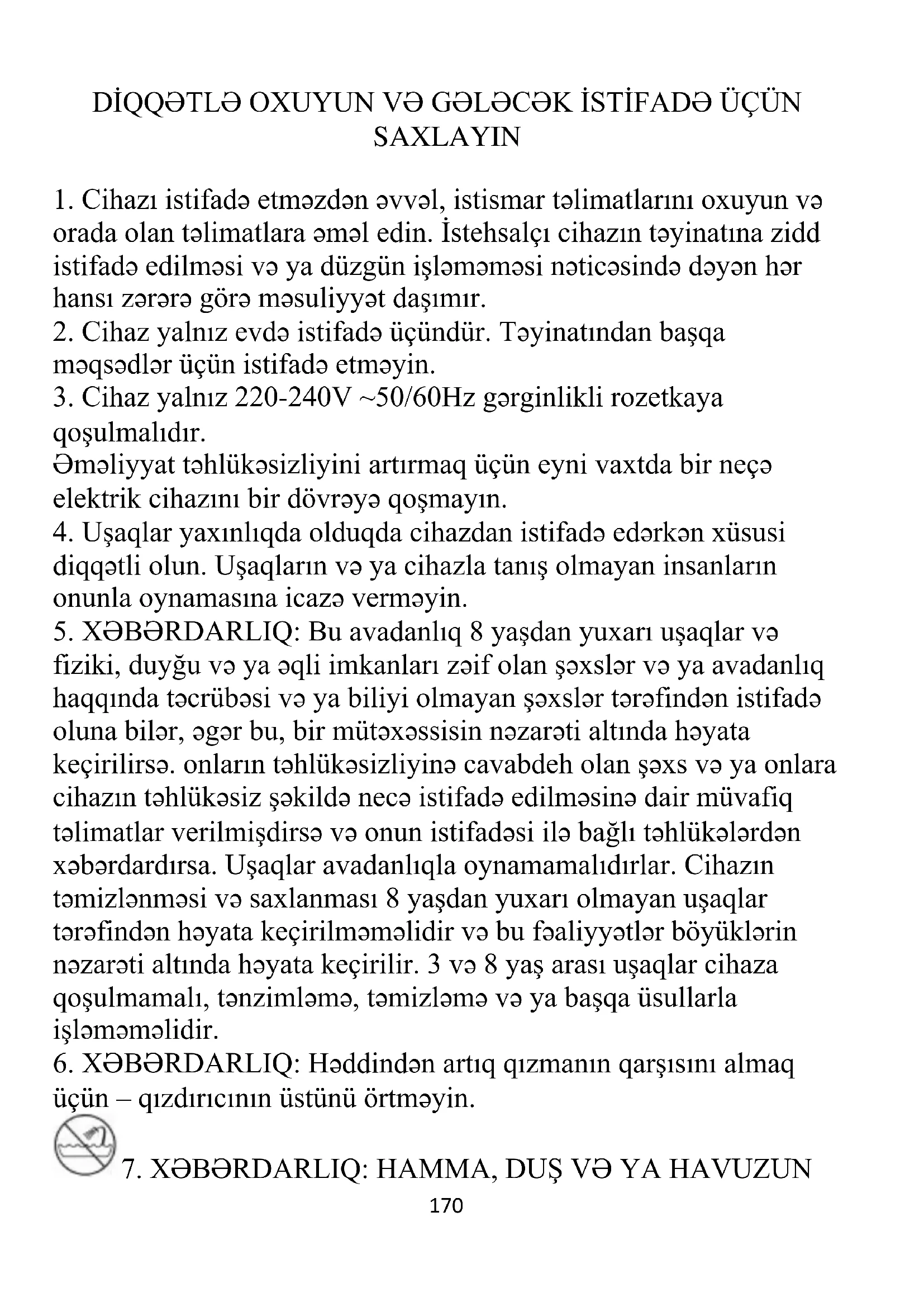 XÖBÖRDARLIQ: Bu avadanlıq 8 Yaşdan yuxarı uzaqlar və fiziki, duygün va ya aqli imkanları zafı olan Şoxsler va ya avadanlıq haqqinda tocrübsi va ya biliyi olmayan Şoxsler törfinden istifadoluna bilar, ögür bu, bir mutxassisin nozarati altinda hoyata seksirilirş. onlarin tahrkəsizliyine cavabdeh olan Şoxs va ya onlara cihazın tahrkəsiz sakkildene istifad edilməsin dair muvwatif talmatlar verilmisi dirse va onun istifadisi ilbagl tahrkərden xerbardirdsr. Uzaqlar avadanlıqla oynamamalidirlar. Cihazın təmizlənmasi va saxlanması 8 Yaşdan yuxarı olmayan uzaqlar törfinden hoyataCLSIRILMəmidir va bu fəaliyyatl er boyuklarin nozarati altinda hoyataCLSIRILR. 3 va 8 ya ası uzaqlar cihaza qoslumamalı, tanzimləm, təmizləm va ya basqa üssullarla islaməmidir.