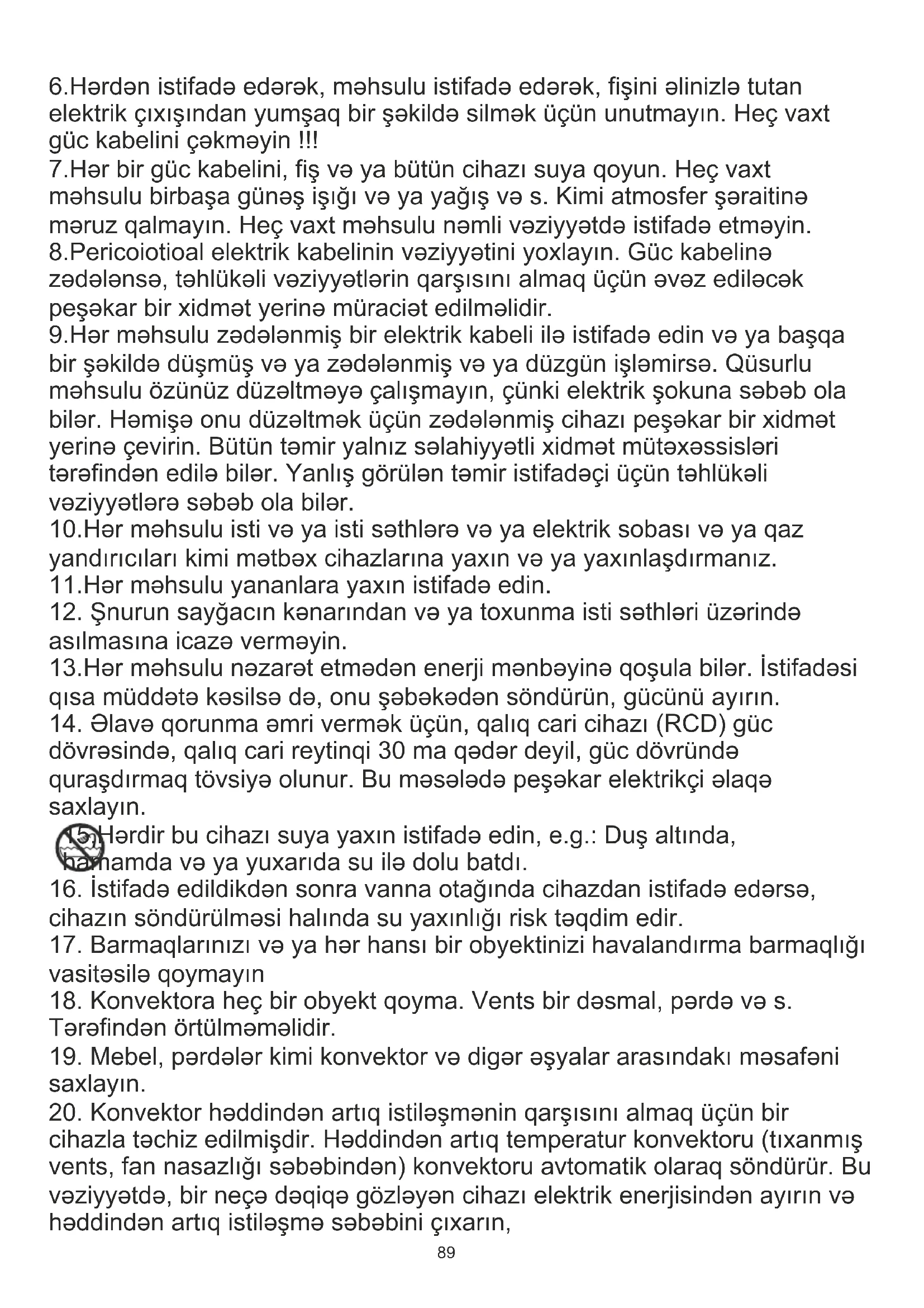 6.Bütün cihazdan çox toz və kirdən qorunmalıdır. Qızdırıcını günəş işığından və kirdən uzaq bir yerə saxlayın. Texniki məlumat Güc 1500w Enerji təchizatı 220-240V ~ 50 / 60hz Zhmt olmasa karton qablaşdırmanı tullantı kağıza köçürün. Polietilen torbaları (PE) plastik qaba tökün Aşınmış cihaz müvafiq anbara qaytarılmalıdır, çünki o, cihazda thlüklidir maddlr traf mühit üçün thlük yarada bilr. Elektrik cihazı limit qdr thvil verilmlidir onun tkrar istifadsi v istifadsi. gr cihazda batareyalar varsa, onu çıxarıb ayrıca saxlanan nöqty vermk lazımdır.92