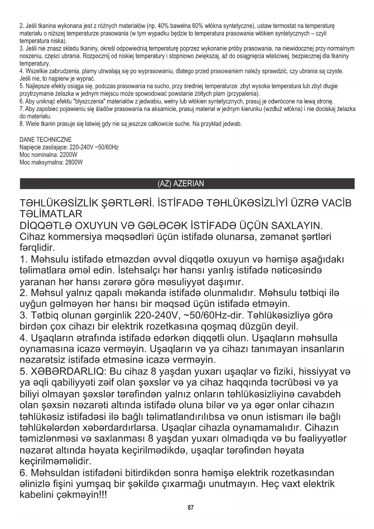 əlinizlə fişini yumşaq bir şəkildə çıxarmağı unutmayın. Heç vaxt elektrik kabelini çəkməyin!!! (AZ) AZERIAN11. Məhsulu heç vaxt isti və ya isti səthlərin və ya elektrik sobası və ya qaz sobası kimi mətbəx cihazlarının üzərinə və ya yaxınına qoymayın.