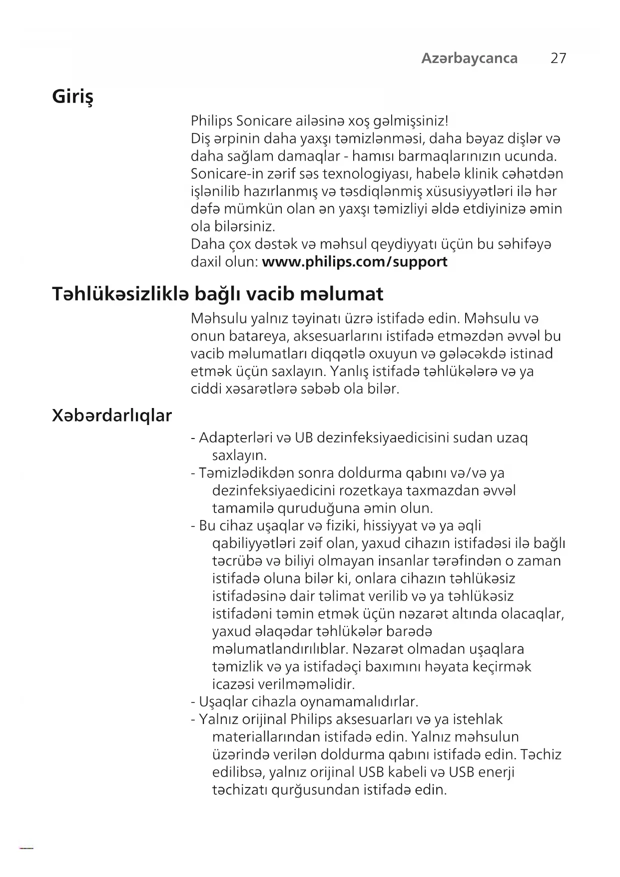 Azərbaycanca Giriş Philips Sonicare ailəsinə xoş gəlmişsiniz! Diş ərpinin daha yaxşı təmizlənməsi, daha bəyaz dişlər və daha sağlam damaqlar - hamısı barmaqlarınızın ucunda. Sonicare-in zərif səs texnologiyası, habelə klinik cəhətdən işlənilib hazırlanmış və təsdiqlənmiş xüsusiyyətləri ilə hər dəfə mümkün olan ən yaxşı təmizliyi əldə etdiyinizə əmin ola bilərsiniz. Daha çox dəstək və məhsul qeydiyyatı üçün bu səhifəyə daxil olun: www.philips.com/support Təhlükəsizliklə bağlı vacib məlumat Məhsulu yalnız təyinatı üzrə istifadə edin. Məhsulu və onun batareya, aksesuarlarını istifadə etməzdən əvvəl bu vacib məlumatları diqqətlə oxuyun və gələcəkdə istinad etmək üçün saxlayın. Yanlış istifadə təhlükələrə və ya ciddi xəsarətlərə səbəb ola bilər. Xəbərdarlıqlar - Adapterləri və UB dezinfeksiyaedicisini sudan uzaq saxlayın. - Təmizlədikdən sonra doldurma qabını və/və ya dezinfeksiyaedicini rozetkaya taxmazdan əvvəl tamamilə quruduğuna əmin olun. - Bu cihaz uşaqlar və fiziki, hissiyyat və ya əqli qabiliyyətləri zəif olan, yaxud cihazın istifadəsi ilə bağlı təcrübə və biliyi olmayan insanlar tərəfindən o zaman istifadə oluna bilər ki, onlara cihazın təhlükəsiz istifadəsinə dair təlimat verilib və ya təhlükəsiz istifadəni təmin etmək üçün nəzarət altında olacaqlar, yaxud əlaqədar təhlükələr barədə məlumatlandırılıblar. Nəzarət olmadan uşaqlara təmizlik və ya istifadəçi baxımını həyata keçirmək icazəsi verilməməlidir. - Uşaqlar cihazla oynamamalıdırlar. - Yalnız orijinal Philips aksesuarları və ya istehlak materiallarından istifadə edin. Yalnız məhsulun üzərində verilən doldurma qabını istifadə edin. Təchiz edilibsə, yalnız orijinal USB kabeli və USB enerji təchizatı qurğusundan istifadə edin.28 Azərbaycanca - Bu cihazda istifadəçinin təmir edə biləcəyi hissələr yoxdur. Cihaz zədələnibsə, ondan istifadəni dayandırın və ölkənizdəki Müştəriyə Xidmət Mərkəzi ilə əlaqə saxlayın. Yalnız şnurlu cihazlar: Şnur zədələnibsə, adapter və ya dezinfeksiyaedicisini yenisi ilə əvəzləyin. - Doldurma qabından və/yaxud dezinfeksiyaedici məhluldan çöldə və ya isti səthlərin yaxınlığında istifadə etməyin. - Məhsulun hər hansı hissəsini qabyuyan maşında təmizləməyin. - Bu cihaz yalnız dişləri, damağı və dili təmizləmək üçün hazırlanıb. - Dezinfeksiyaedici vasitəni həmişə uşaqların əli çatmayan yerdə saxlayın. - Qapı açıq olduqda UB lampası yanırsa, dezinfeksiyaedici vasitədən istifadəni dayandırın. UB lampa şüaları insan gözünə və dərisinə zərər verə bilər. - Dezinfeksiyaedici vasitəni yalnız qoruyucu ekran üçün işlədin. - Qızdıqda UB dezinfeksiyaedicisinin UB lampasına toxunmayın. - Fırça başlığının xovları zədələnib və ya əyilibsə, ondan istifadəni dayandırın. Köhnəlmə əlamətləri üzə çıxsa, fırça başlığını hər 3 aydan bir və ya daha tez-tez dəyişdirin. - Tərkibində efir yağları və ya kokos yağı olan məhsullarla birbaşa təmasdan çəkinin. Bu cür təmas tüklərin yerindən çıxmasına səbəb ola bilər. - İstifadədən sonra həddən artıq qanama olsa, qanama 1 həftəlik istifadədən sonra yenə də davam etsə və ya narahatlıq, yaxud ağrı hiss etsəniz, cihazdan istifadəni dayandırın və stomatoloqunuz/həkiminiz ilə məsləhətləşin. - Ötən 2 ay ərzində ağız və diş əti əməliyyatı keçirmisinizsə, bu cihazı istifadə etməzdən əvvəl stomatoloqunuz ilə məsləhətləşin.29 Azərbaycanca - Əgər sizdə kardiostimulyator və ya başqa implantasiya edilmiş cihaz varsa, istifadə etməzdən əvvəl həkiminizlə və ya implantasiya edilmiş cihazın istehsalçısı ilə əlaqə saxlayın. - Sağlamlıq problemləriniz varsa, bu cihazı istifadə etməzdən əvvəl həkiminiz ilə məsləhətləşin. - Cihaz şəxsi gigiyena cihazıdır və stomatoloji praktikada və ya müəssisədə çoxsaylı xəstələrdə istifadə üçün nəzərdə tutulmayıb. Batareya təhlükəsizliyinə dair təlimatlar - Bu cihazda yalnız təcrübəli şəxslər tərəfindən dəyişdirilə bilən batareyalar var. - Məhsulu yalnız təyinatı üzrə istifadə edin. Məhsulu və onun batareya, aksesuarlarını istifadə etməzdən əvvəl bu məlumatları diqqətlə oxuyun və gələcəkdə istinad etmək üçün saxlayın. Yanlış istifadə təhlükələrə və ya ciddi xəsarətlərə səbəb ola bilər. Verilən aksesuarlar müxtəlif məhsullar üçün fərqli ola bilər. - Yalnız orijinal Philips aksesuarları və istehlak materiallarından istifadə edin. Yalnız TCBxxxx, HX6100, HX6110, HX6160 və ya WAAxxxx çıxarıla bilən enerji təchizatı blokundan istifadə edin. - Məhsulu və batareyaları oddan uzaq saxlayın və onları birbaşa günəş işığı və ya yüksək temperatura məruz qoymayın. - Məhsul anormal şəkildə qızar və ya qoxu gələrsə, rəngini dəyişər və ya şarj normaldan daha uzun müddət davam edərsə, məhsulu istifadə etməyi, həmçinin şarj etməyi dayandırın və Philips ilə əlaqə saxlayın. - Məhsulları və onların batareyalarını mikrodalğalı soba və ya induksiyalı ocaqlara qoymayın. - Batareyaların qızmaması və ya zəhərli, təhlükəli maddələr buraxmaması üçün məhsulu və ya batareyanı açmayın, dəyişdirməyin, deşməyin, zədələməyin və ya sökməyin. Batareyanın qısa qapanmasına, həddindən artıq və ya əks şarj edilməsinə yol verməyin.30 Azərbaycanca - Bu cihazda təmir oluna bilən hissələr yoxdur. Batareyanın istismar müddəti başa çatdıqda, cihaz lazımi qaydada atılmalıdır (təkrar emal bölməsinə baxın). - Batareyalar zədələnərsə və ya sızdırarsa, onların dəri və ya gözl