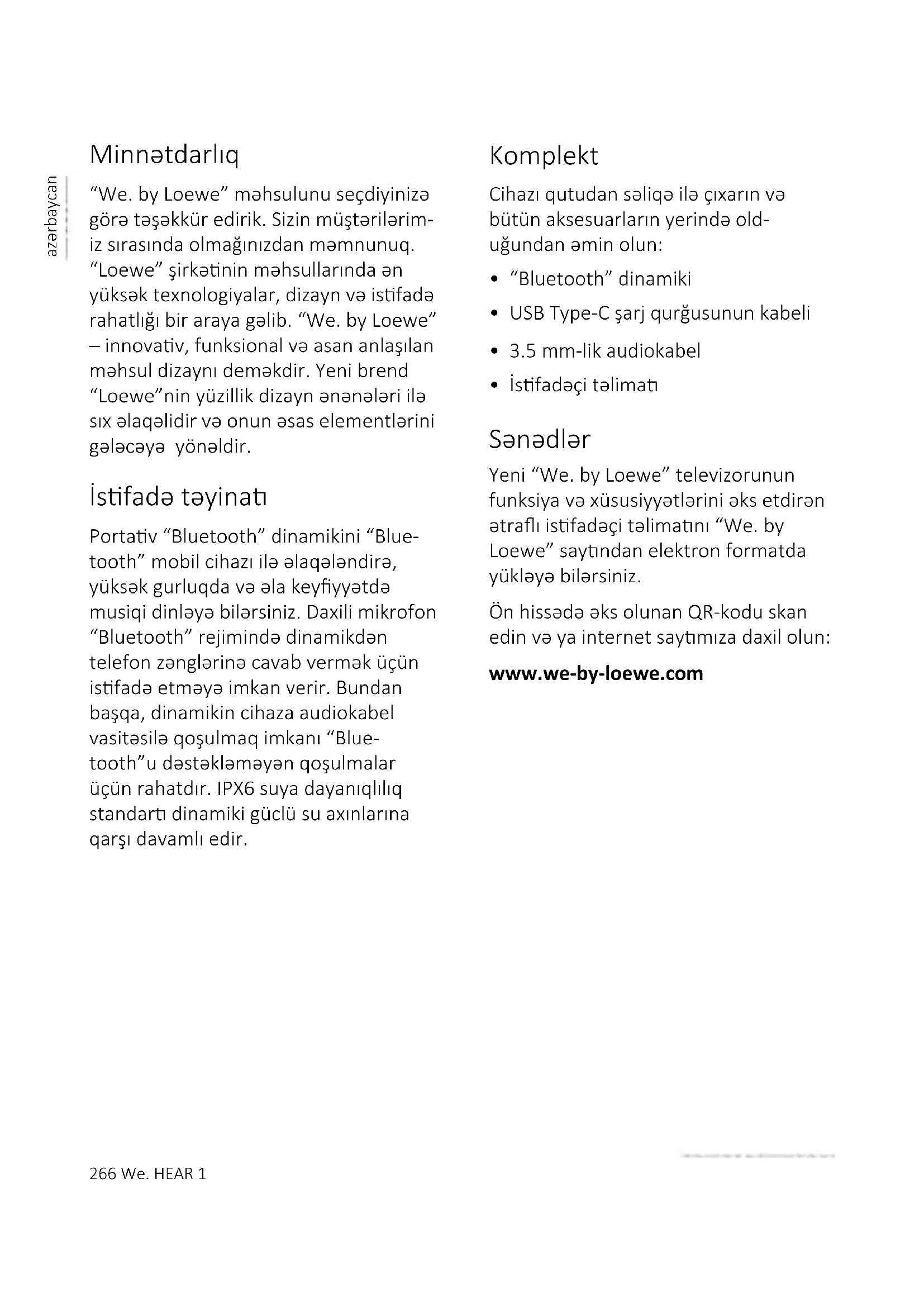 20 – 70%266 We. HEAR 1 azərbaycan Minnətdarlıq “We. by Loewe” məhsulunu seçdiyinizə görə təşəkkür edirik. Sizin müştərilərim- iz sırasında olmağınızdan məmnunuq. “Loewe” şirkənin məhsullarında ən yüksək texnologiyalar, dizayn və isfadə rahatlığı bir araya gəlib. “We. by Loewe” – innovav, funksional və asan anlaşılan məhsul dizaynı deməkdir. Yeni brend “Loewe”nin yüzillik dizayn ənənələri ilə sıx əlaqəlidir və onun əsas elementlərini gələcəyə yönəldir. İsfadə təyina Portav “Bluetooth” dinamikini “Blue- tooth” mobil cihazı ilə əlaqələndirə, yüksək gurluqda və əla keyyyətdə musiqi dinləyə bilərsiniz. Daxili mikrofon “Bluetooth” rejimində dinamikdən telefon zənglərinə cavab vermək üçün isfadə etməyə imkan verir. Bundan başqa, dinamikin cihaza audiokabel vasitəsilə qoşulmaq imkanı “Blue- tooth”u dəstəkləməyən qoşulmalar üçün rahatdır. IPX6 suya dayanıqlılıq standar dinamiki güclü su axınlarına qarşı davamlı edir. Komplekt Cihazı qutudan səliqə ilə çıxarın və bütün aksesuarların yerində old- uğundan əmin olun: