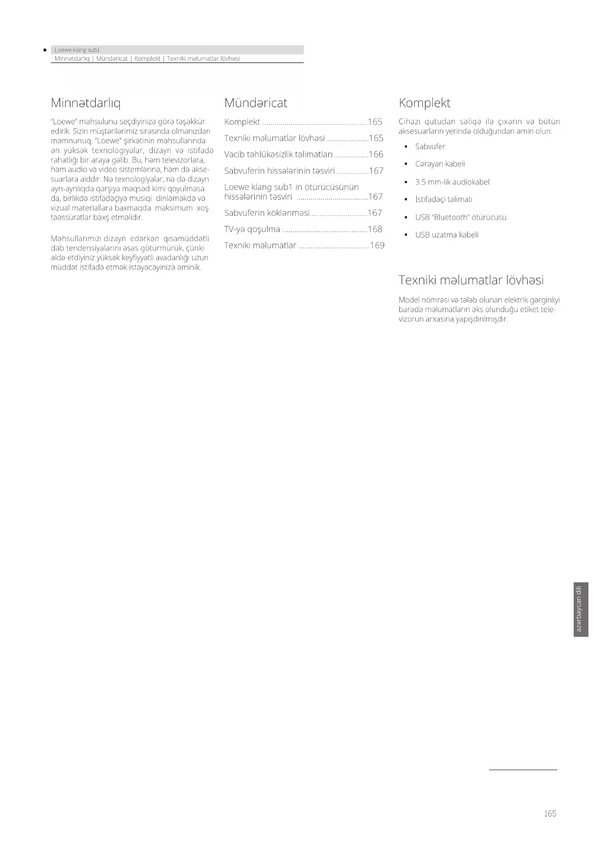 Bluetooth® nisani va logolan Bluetooth SIG Inc. sirkatinin qcydiyyatdan kecmis ticaret nisanlanir va "Loewe Technology GmbH" tarifanden bela markalarin har hansi istifadasi liscziya asasinda hayata kecirilr. Diger ticaret nisanlari va ticarol adlan onlarin muvafiq sahiblarina maxsusdur.
