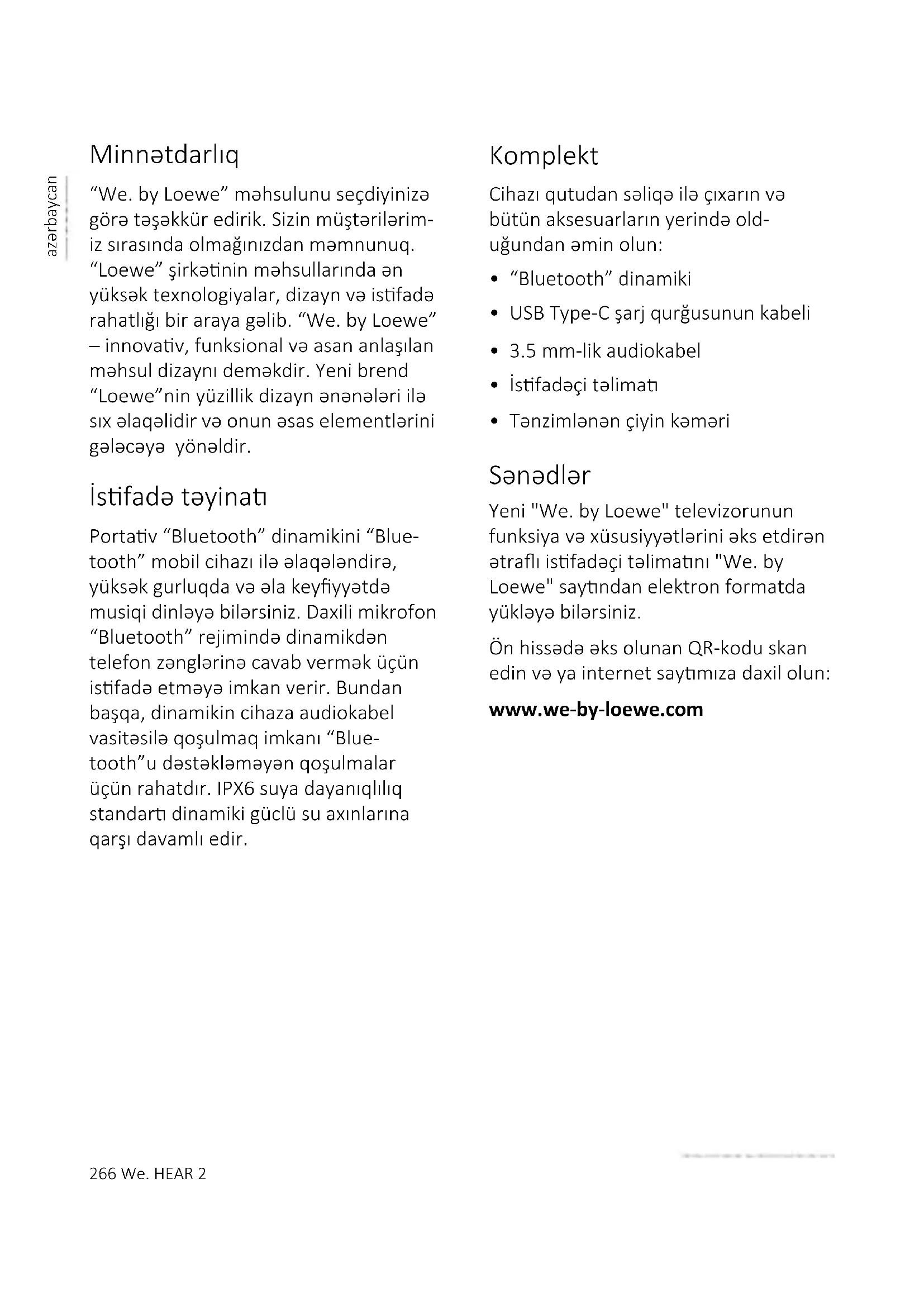 20 – 70%266 We. HEAR 2 azərbaycan Minnətdarlıq “We. by Loewe” məhsulunu seçdiyinizə görə təşəkkür edirik. Sizin müştərilərim- iz sırasında olmağınızdan məmnunuq. “Loewe” şirkənin məhsullarında ən yüksək texnologiyalar, dizayn və isfadə rahatlığı bir araya gəlib. “We. by Loewe” – innovav, funksional və asan anlaşılan məhsul dizaynı deməkdir. Yeni brend “Loewe”nin yüzillik dizayn ənənələri ilə sıx əlaqəlidir və onun əsas elementlərini gələcəyə yönəldir. İsfadə təyina Portav “Bluetooth” dinamikini “Blue- tooth” mobil cihazı ilə əlaqələndirə, yüksək gurluqda və əla keyyyətdə musiqi dinləyə bilərsiniz. Daxili mikrofon “Bluetooth” rejimində dinamikdən telefon zənglərinə cavab vermək üçün isfadə etməyə imkan verir. Bundan başqa, dinamikin cihaza audiokabel vasitəsilə qoşulmaq imkanı “Blue- tooth”u dəstəkləməyən qoşulmalar üçün rahatdır. IPX6 suya dayanıqlılıq standar dinamiki güclü su axınlarına qarşı davamlı edir. Komplekt Cihazı qutudan səliqə ilə çıxarın və bütün aksesuarların yerində old- uğundan əmin olun: