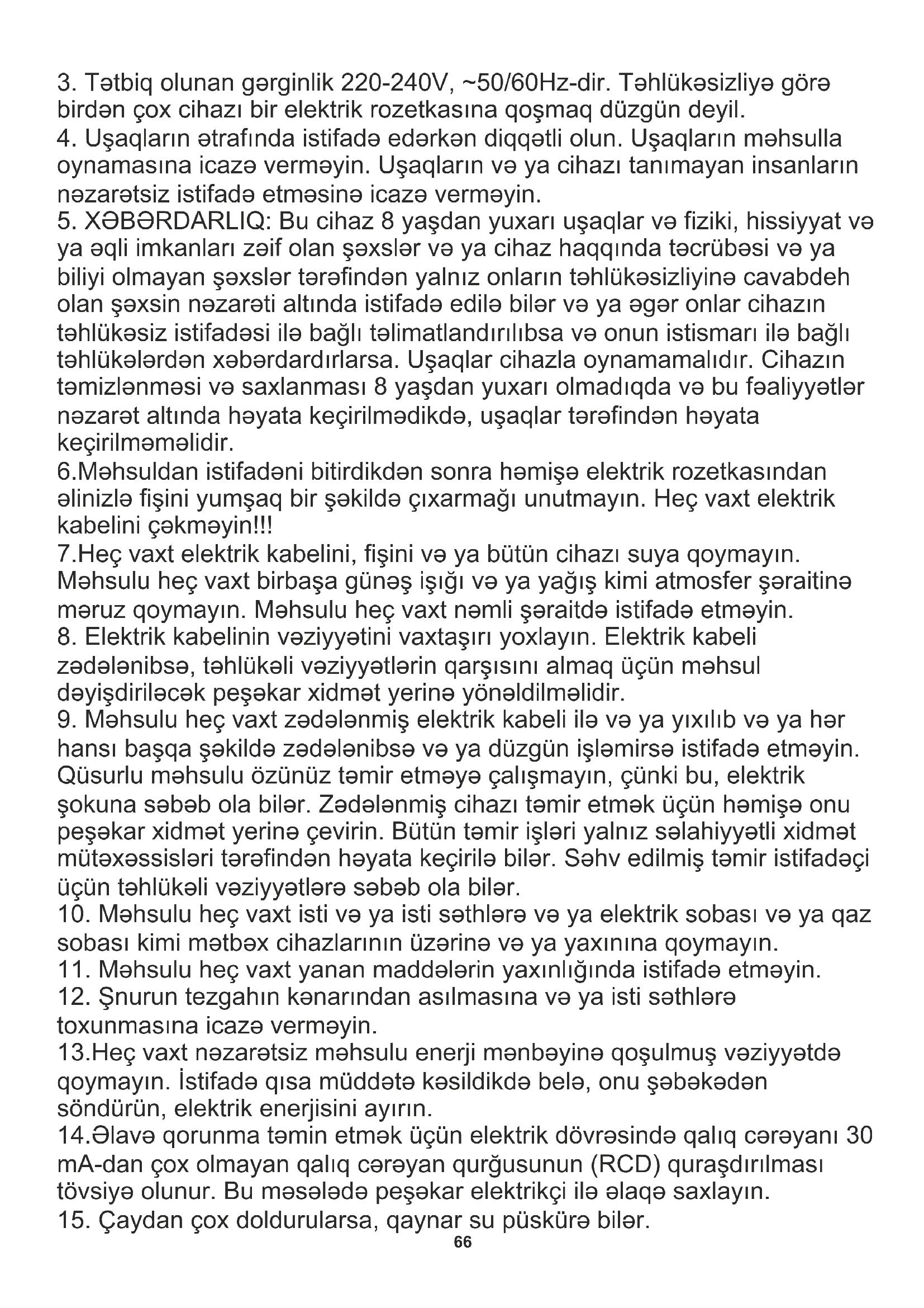 ya əqli imkanları zəif olan şəxslər və ya cihaz haqqında təcrübəsi və ya biliyi olmayan şəxslər tərəfindən yalnız onların təhlükəsizliyinə cavabdeh olan şəxsin nəzarəti altında istifadə edilə bilər və ya əgər onlar cihazın təhlükəsiz istifadəsi ilə bağlı təlimatlandırılıbsa və onun istismarı ilə bağlı təhlükələrdən xəbərdardırlarsa. Uşaqlar cihazla oynamamalıdır. Cihazın təmizlənməsi və saxlanması 8 yaşdan yuxarı olmadıqda və bu fəaliyyətlər nəzarət altında həyata keçirilmədikdə, uşaqlar tərəfindən həyata keçirilməməlidir. 6.Məhsuldan istifadəni bitirdikdən sonra həmişə elektrik rozetkasından əlinizlə fişini yumşaq bir şəkildə çıxarmağı unutmayın. Heç vaxt elektrik kabelini çəkməyin!!! 7.Heç vaxt elektrik kabelini, fişini və ya bütün cihazı suya qoymayın. Məhsulu heç vaxt birbaşa günəş işığı və ya yağış kimi atmosfer şəraitinə məruz qoymayın. Məhsulu heç vaxt nəmli şəraitdə istifadə etməyin.