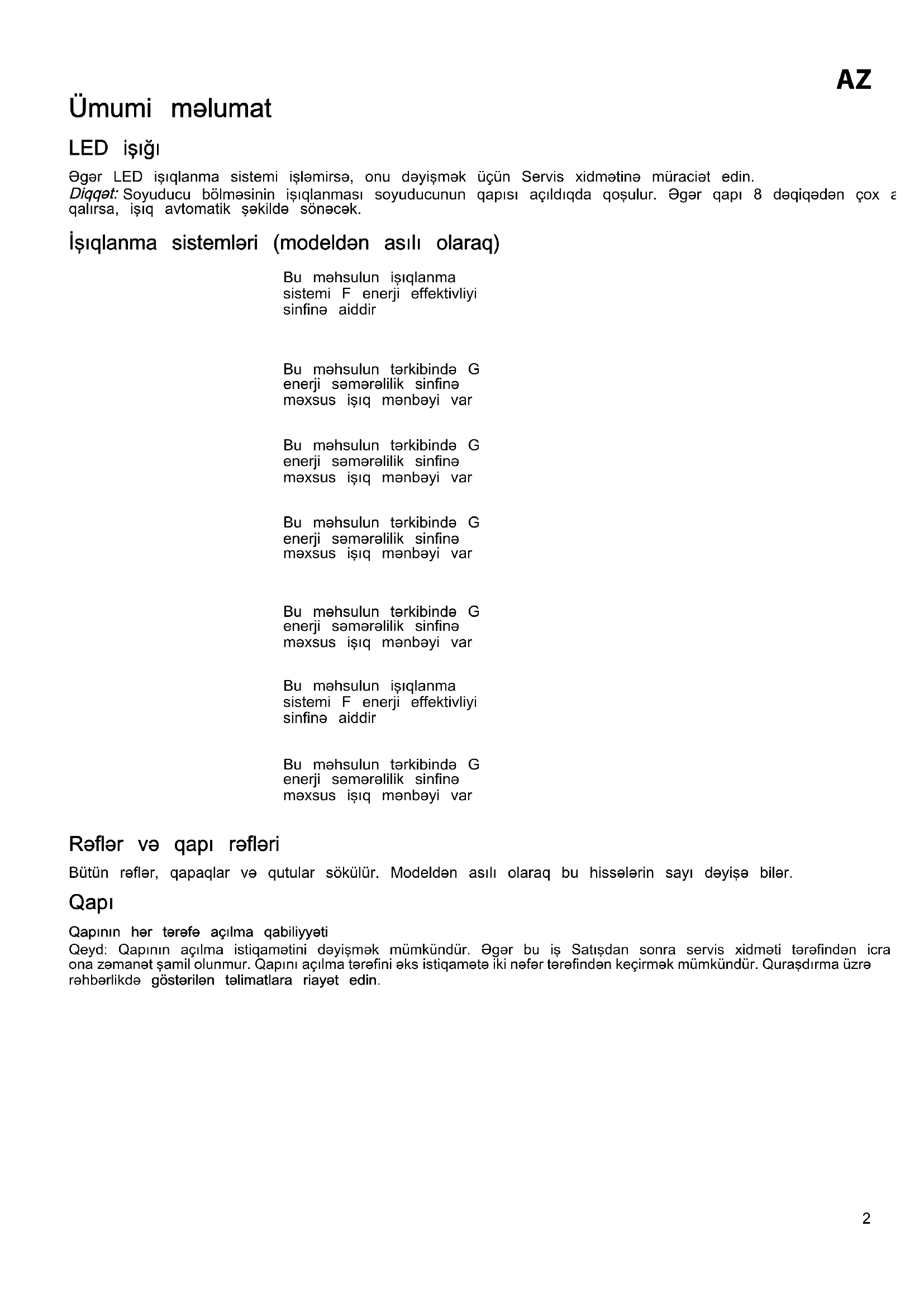 Ümumi məlumat LED işığı Əgər LED işıqlanma sistemi işləmirsə, onu dəyişmək üçün Servis xidmətinə müraciət edin. Diqqət: Soyuducu bölməsinin işıqlanması soyuducunun qapısı açıldıqda qoşulur. Əgər qapı 8 dəqiqədən çox açıq qalırsa, işıq avtomatik şəkildə sönəcək. İşıqlanma sistemləri (modeldən asılı olaraq) Bu məhsulun işıqlanma sistemi F enerji effektivliyi sinfinə aiddir Bu məhsulun tərkibində G enerji səmərəlilik sinfinə məxsus işıq mənbəyi var Bu məhsulun tərkibində G enerji səmərəlilik sinfinə məxsus işıq mənbəyi var Bu məhsulun tərkibində G enerji səmərəlilik sinfinə məxsus işıq mənbəyi var Bu məhsulun tərkibində G enerji səmərəlilik sinfinə məxsus işıq mənbəyi var Bu məhsulun işıqlanma sistemi F enerji effektivliyi sinfinə aiddir Bu məhsulun tərkibində G enerji səmərəlilik sinfinə məxsus işıq mənbəyi var Rəflər və qapı rəfləri Bütün rəflər, qapaqlar və qutular sökülür. Modeldən asılı olaraq bu hissələrin sayı dəyişə bilər. Qapı Qapının hər tərəfə açılma qabiliyyətiQeyd: Qapının açılma istiqamətini dəyişmək mümkündür. Əgər bu iş Satışdan sonra servis xidməti tərəfindən icra olunursa, ona zəmanət şamil olunmur. Qapını açılma tərəfini əks istiqamətə iki nəfər tərəfindən keçirmək mümkündür. Quraşdırma üzrə rəhbərlikdə göstərilən təlimatlara riayət edin.3 Cihazdan necə istifadə etmək İlk dəfə istifadə etdikdə Soyuducunu quraşdırdıqdan sonra onu elektrik şəbəkəsinə qoşmazdan əvvəl ən azı iki saat gözləyin. Qoşduqdan sonra soyuducu avtomatik şəkildə işləməyə başlayacaq. Mükəmməl temperatur göstəriciləri istehsalçı zavodda ilkin nizamlanıbdır. Soyuducunu elektrik şəbəkəsinə qoşduqdan sonra düzgün qida saxlanma temperaturunu yığmaq üçün ən azı 4-6 saat gözləyin. Soyuducu bölməsi və qida məhsullarının saxlanması Soyuducu bölməsində təzə qida məhsullarını və içkiləri saxlamaq mümkündür. Soyuducu bölməsinin donu tam avtomatik şəkildə açılır. Bölmənin daxili arxa divarında vaxtaşırı yaranan su damlaları avtomatik donun açılma mərhələsinin göstəricisidir. Don açılan zaman yaranan su drenaj vasitəsi ilə xüsusi qaba yönəldilir, orada yığılır və oradan buxarlanma yolu ilə xaric olunur. Qeyd: ətraf temperatur, qapıların hansı tezliklə açılıb bağlanması, cihazın yerləşdiyi yer iki bölmənin daxili temperaturuna təsir göstərə bilər. Bu amillərdən asılı olaraq temperatur ölçüləri quraşdırılır. Yüksək rütubətli yerlərdə soyuducu bölməsində kondensasiya hallarına, ələlxüsus şüşə rəflərdə rast gəlmək mümkündür. Belə hallarda soyuducuda saxlanılan maye olan qabların ağzını (məsələn, qaznaları) bağlamaq, yüksək su tərkibli qida məhsullarını (məsələn tərəvəzləri) qablaşdırmaq və, əgər varsa, ventilyatoru qoşmaq tövsiyə olunur. Bütün siyirtmələr, qapı rəfləri və rəflər sökülə bilər. Hava dövriyyəsi Soyuducu bölmənin içində havanın təbii dövriyyəsi müxtəlif temperaturlu zonaların yaranmasına gətirib çıxarır. Kifayət qədər ventilyasiya olmayan zaman enerji sərfiyyəti artır, soyuducunun məhsuldarlığı azalır. Təzə qida məhsullarını və içkiləri necə saxlamaq Böyük miqdarda etilen qazı ifraz edən qida məhsulların (almalar, əriklər, armudlar, şaftalılar, avokadolar, əncirlər, gavalılar, qaragilələrt, yemişlər, paxlalar) və bu qazın təsirinə həssas meyvə, tərəvəz və salat kimi ərzaqların saxlanma müddəti kifayət qədər uzun olsun deyə, onları ayrıca və ya qablaşdırılmış halda saxlamaq lazımdır; məsələn, pomidorları kivi və ya kələmlə birgə saxlamaq olmaz. Havanın daha yaxşı dövr etməsi üçün ğrzaqları sıx yerləşdirmək məsləhət deyil. Ərzaqları saxlamaq üçün təkrar istifadə üçün yararlı plastik, alümin və şüşə qablardan, qablaşma plyonkasından istifadə edin. Əgər soyuducuda kiçik həcmli ərzaqların saxlanması lazımdırsa, meyvə və tərəvəz siyirtmələrinin üstündə yerləşən rəfdən istifadə etmək məsləhətdir, çünki bu rəf soyuducu bölməsinin ən soyuq yeridir. Mayelərin və ya qoxusu yaxud ətri olan ərzaqları saxlanması üçün həmişə qapalı qablardan istifadə edin və ya sadəcə üstlərini örtun. Butulkaların düşməsinin qarşısını almaq üçün butulka tutuculardan (bəzi modellərdə mövcuddur) istifadə edin. Dondurucu bölməsi və qidanın saxlanması Dondurucu bölməsinin köməyi ilə donmuş qida məhsulları saxlanılır, təzə qida məhsulları dondurulur. Müəyyən vaxt intervalında saxlanıla bilən təzə qida məhsulların həcmi göstəricilər lövhəciyində göstərilib. Təzə qida məhsullarını dondurucu bölmədə elə yerləşdirin ki, havanın maneəsiz dövr etməsi üçün onların ətrafında kifayət qədər yer olsun. Təzə qida ilə donmuş qida arasında təmas olmamalıdır. Yük limitləri səbət, qapaq, siyirtmə, rəflər və s. təyin edilir. Soyuducunun bu hissələrini yüklədikdən sonra onların kip bağlanmasına diqqət yetirin. Dondurma sürətini optimallaşdırmaq və daha çox saxlanma yerini əldə etmək üçün, dondurucu bölmədən siyirtmələri çıxarmaq mümkündür. Dondurucunun siyirtmə qabının çıxarılması