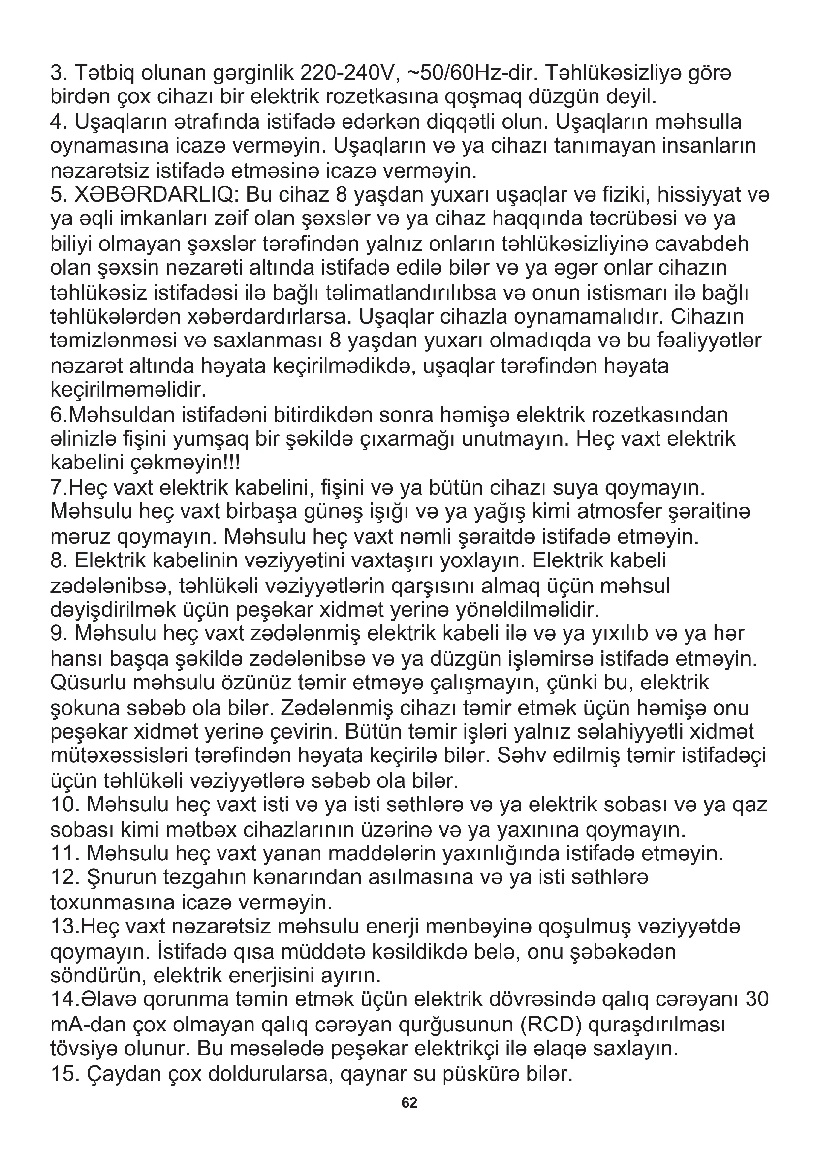 toxunmasına icazə verməyin. 13.Heç vaxt nəzarətsiz məhsulu enerji mənbəyinə qoşulmuş vəziyyətdə qoymayın. İstifadə qısa müddətə kəsildikdə belə, onu şəbəkədən söndürün, elektrik enerjisini ayırın. 14.Əlavə qorunma təmin etmək üçün elektrik dövrəsində qalıq cərəyanı 30 mA-dan çox olmayan qalıq cərəyan qurğusunun (RCD) quraşdırılması tövsiyə olunur. Bu məsələdə peşəkar elektrikçi ilə əlaqə saxlayın. 6.Məhsuldan istifadəni bitirdikdən sonra həmişə elektrik rozetkasından əlinizlə fişini yumşaq bir şəkildə çıxarmağı unutmayın. Heç vaxt elektrik kabelini çəkməyin!!!