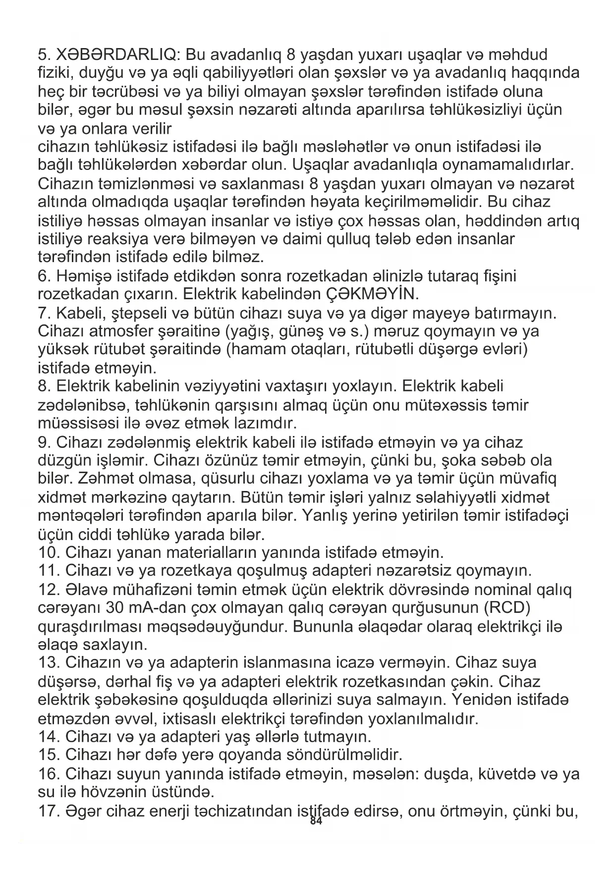 5. Cihaz heyvanları qızdırmaq üçün istifadə edilməməlidir.86