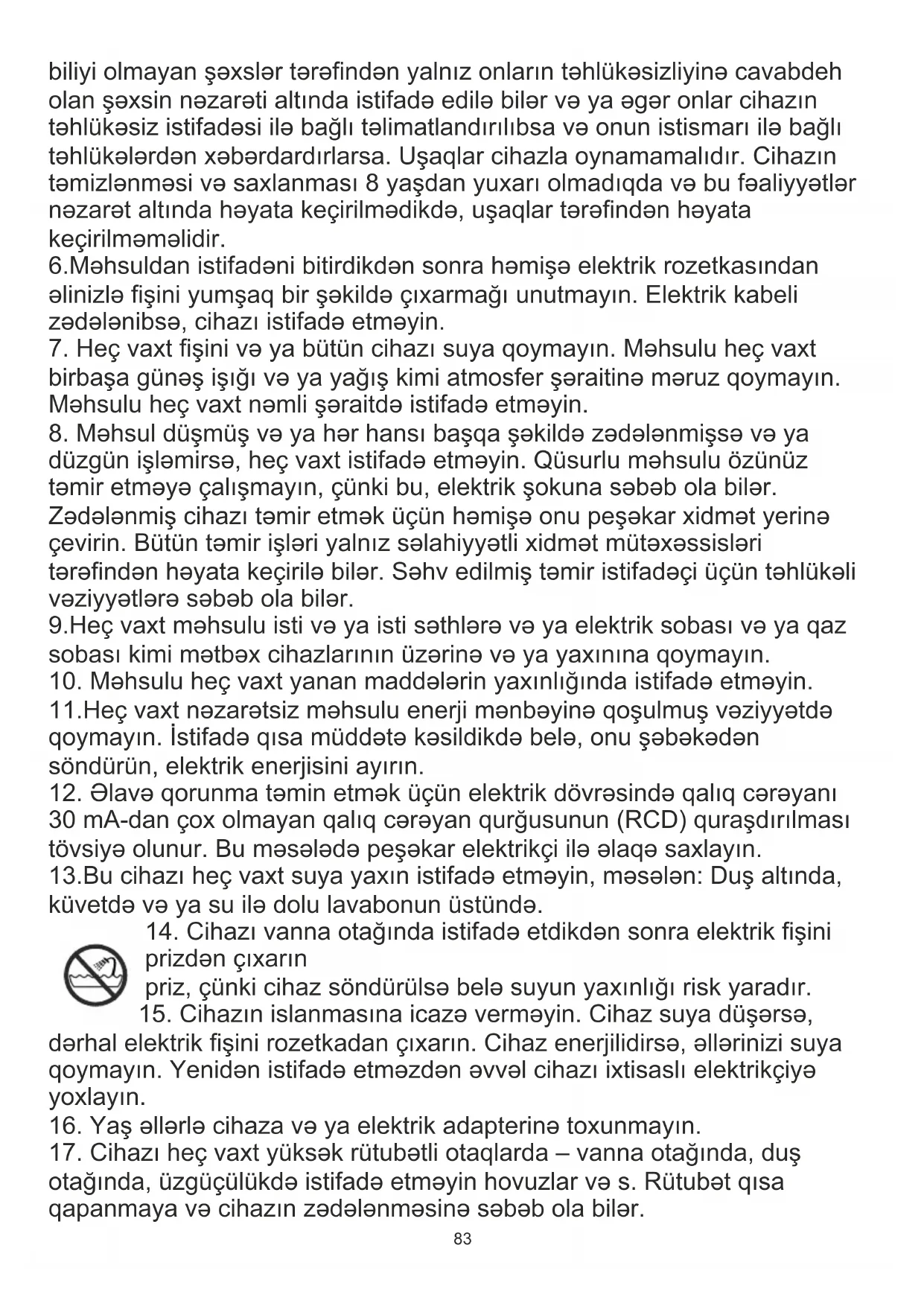 30 mA-dan çox olmayan qalıq cərəyan qurğusunun (RCD) quraşdırılması tövsiyə olunur. Bu məsələdə peşəkar elektrikçi ilə əlaqə saxlayın. 13.Bu cihazı heç vaxt suya yaxın istifadə etməyin, məsələn: Duş altında, küvetdə və ya su ilə dolu lavabonun üstündə.