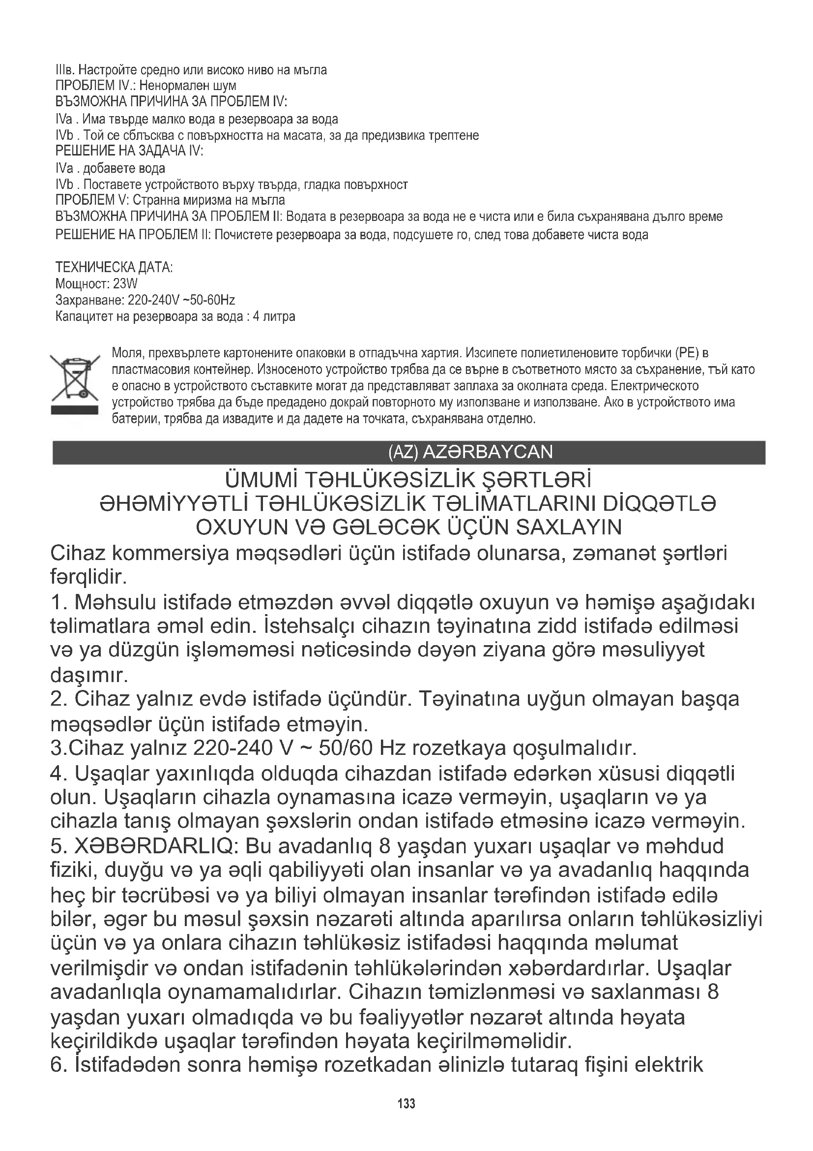 23. Nəmləndirici bazanı suya batırmayın. Cihazın üzərinə su tökülərsə,