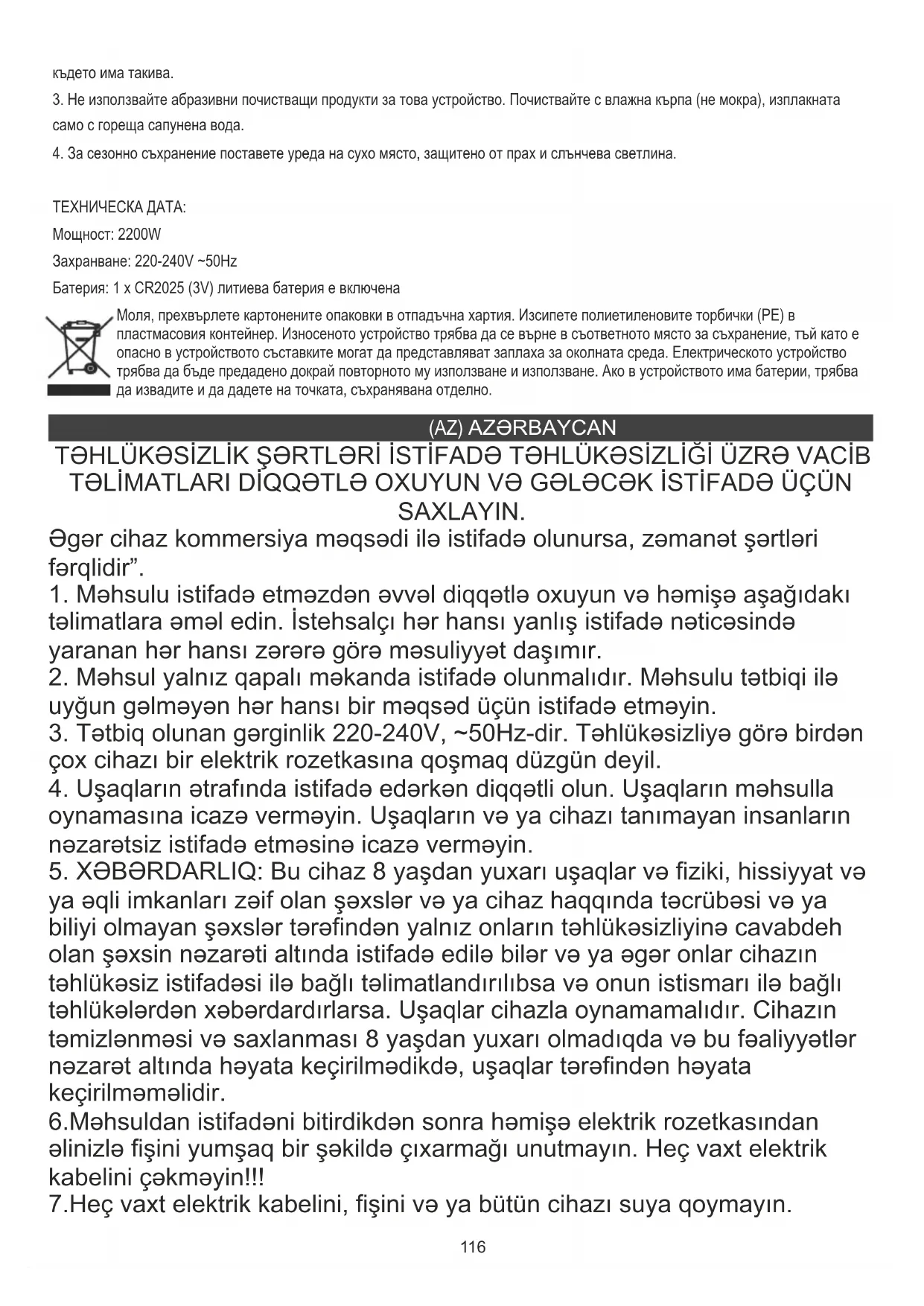 ya əqli imkanları zəif olan şəxslər və ya cihaz haqqında təcrübəsi və ya biliyi olmayan şəxslər tərəfindən yalnız onların təhlükəsizliyinə cavabdeh olan şəxsin nəzarəti altında istifadə edilə bilər və ya əgər onlar cihazın təhlükəsiz istifadəsi ilə bağlı təlimatlandırılıbsa və onun istismarı ilə bağlı təhlükələrdən xəbərdardırlarsa. Uşaqlar cihazla oynamamalıdır. Cihazın təmizlənməsi və saxlanması 8 yaşdan yuxarı olmadıqda və bu fəaliyyətlər nəzarət altında həyata keçirilmədikdə, uşaqlar tərəfindən həyata keçirilməməlidir. 6.Məhsuldan istifadəni bitirdikdən sonra həmişə elektrik rozetkasından əlinizlə fişini yumşaq bir şəkildə çıxarmağı unutmayın. Heç vaxt elektrik kabelini çəkməyin!!! 7.Heç vaxt elektrik kabelini, fişini və ya bütün cihazı suya qoymayın.117 Məhsulu heç vaxt birbaşa günəş işığı və ya yağış kimi atmosfer şəraitinə məruz qoymayın. Məhsulu heç vaxt nəmli şəraitdə istifadə etməyin.