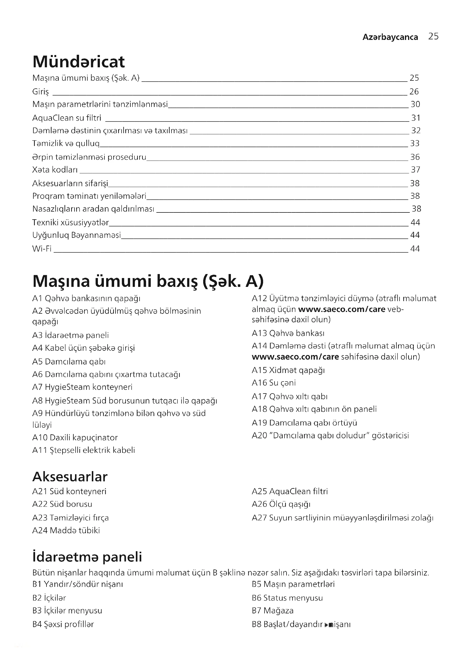 Azərbaycanca Mündəricat Maşına ümumi baxış (Şək. A) _______________________________________________________________ 25 Giriş ____________________________________________________________________________________ 26 Maşın parametrlərini tənzimlənməsi_________________________________________________________ 30 AquaClean su filtri ________________________________________________________________________ 31 Dəmləmə dəstinin çıxarılması və taxılması ____________________________________________________ 32 Təmizlik və qulluq_________________________________________________________________________ 33 Ərpin təmizlənməsi proseduru______________________________________________________________ 36 Xəta kodları ______________________________________________________________________________ 37 Aksesuarların sifarişi_______________________________________________________________________ 38 Proqram təminatı yeniləmələri______________________________________________________________ 38 Nasazlıqların aradan qaldırılması ____________________________________________________________ 38 Texniki xüsusiyyətlər_______________________________________________________________________ 44 Uyğunluq Bəyannaməsi____________________________________________________________________ 44 Wi-Fi ____________________________________________________________________________________ 44 Maşına ümumi baxış (Şək. A) A1 Qəhvə bankasının qapağı A2 Əvvəlcədən üyüdülmüş qəhvə bölməsinin qapağı A3 İdarəetmə paneli A4 Kabel üçün şəbəkə girişi A5 Damcılama qabı A6 Damcılama qabını çıxartma tutacağı A7 HygieSteam konteyneri A8 HygieSteam Süd borusunun tutqacı ilə qapağı A9 Hündürlüyü tənzimlənə bilən qəhvə və süd lüləyi A10 Daxili kapuçinator A11 Ştepselli elektrik kabeli A12 Üyütmə tənzimləyici düymə (ətraflı məlumat almaq üçün www.saeco.com/care veb- səhifəsinə daxil olun) A13 Qəhvə bankası A14 Dəmləmə dəsti (ətraflı məlumat almaq üçün www.saeco.com/care səhifəsinə daxil olun) A15 Xidmət qapağı A16 Su çəni A17 Qəhvə xıltı qabı A18 Qəhvə xıltı qabının ön paneli A19 Damcılama qabı örtüyü A20 “Damcılama qabı doludur” göstəricisi Aksesuarlar A21 Süd konteyneri A22 Süd borusu A23 Təmizləyici fırça A24 Maddə tübiki A25 AquaClean filtri A26 Ölçü qaşığı A27 Suyun sərtliyinin müəyyənləşdirilməsi zolağı İdarəetmə paneli Bütün nişanlar haqqında ümumi məlumat üçün B şəklinə nəzər salın. Siz aşağıdakı təsvirləri tapa bilərsiniz. B1 Yandır/söndür nişanı B2 İçkilər B3 İçkilər menyusu B4 Şəxsi profillər B5 Maşın parametrləri B6 Status menyusu B7 Mağaza B8 Başlat/dayandır nişanı26 Azərbaycanca Giriş Saeco tam avtomat qəhvə maşınını satın aldığınız üçün sizi təbrik edirik! Saeco-nun təklif etdiyi onlayn dəstəkdən tam yararlanmaq üçün daxili Wi-Fi bağlantısı vasitəsilə idarəetmə panelindən istifadə edərək qəhvə maşınınızı qeydiyyatdan keçirə və ya www.saeco.com/MyCoffeeMachine internet səhifəsinə keçərək məhsulunuzu qeydiyyatdan keçirə bilərsiniz. Maşını ilk dəfə istifadə etməzdən əvvəl ayrıca təhlükəsizlik kitabçasını diqqətlə oxuyun və onu gələcəkdə istinad üçün saxlayın. Saeco tam avtomatik qəhvə maşınınız sizə qəhvə ilə bağlı təcrübənizi artırmaq üçün Wi-Fi şəbəkənizə qoşulmaq imkanı verir. Qəhvə maşınını Wi-Fi şəbəkəsinə qoşmaqla aşağıdakıları edə biləcəksiniz: