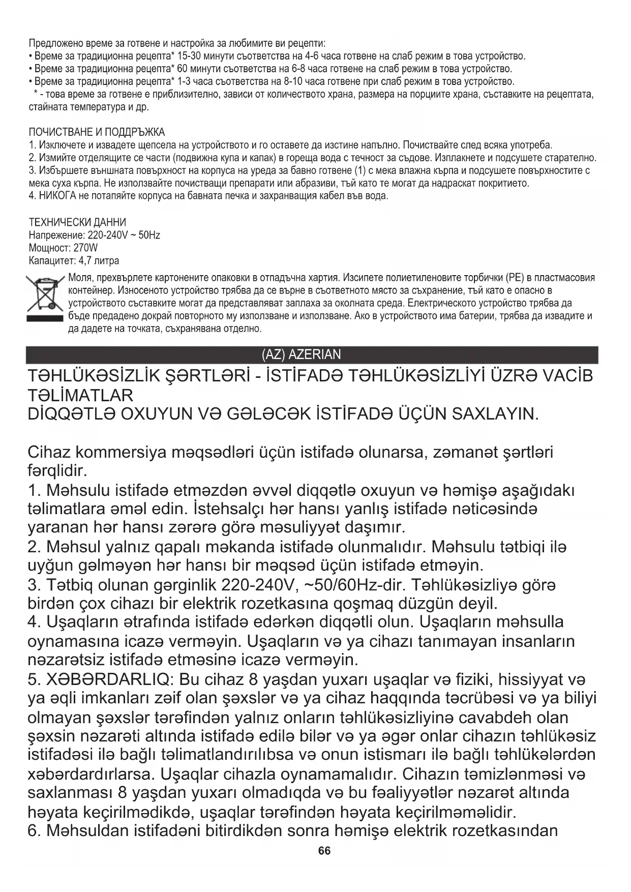 - - bu bişirmə vaxtı təxminidir, yeməyin miqdarından, yemək porsiyalarının ölçüsündən, reseptin inqrediyentlərindən, otaq temperaturundan və s. asılıdır. TƏMİZLİK VƏ XİDMƏT