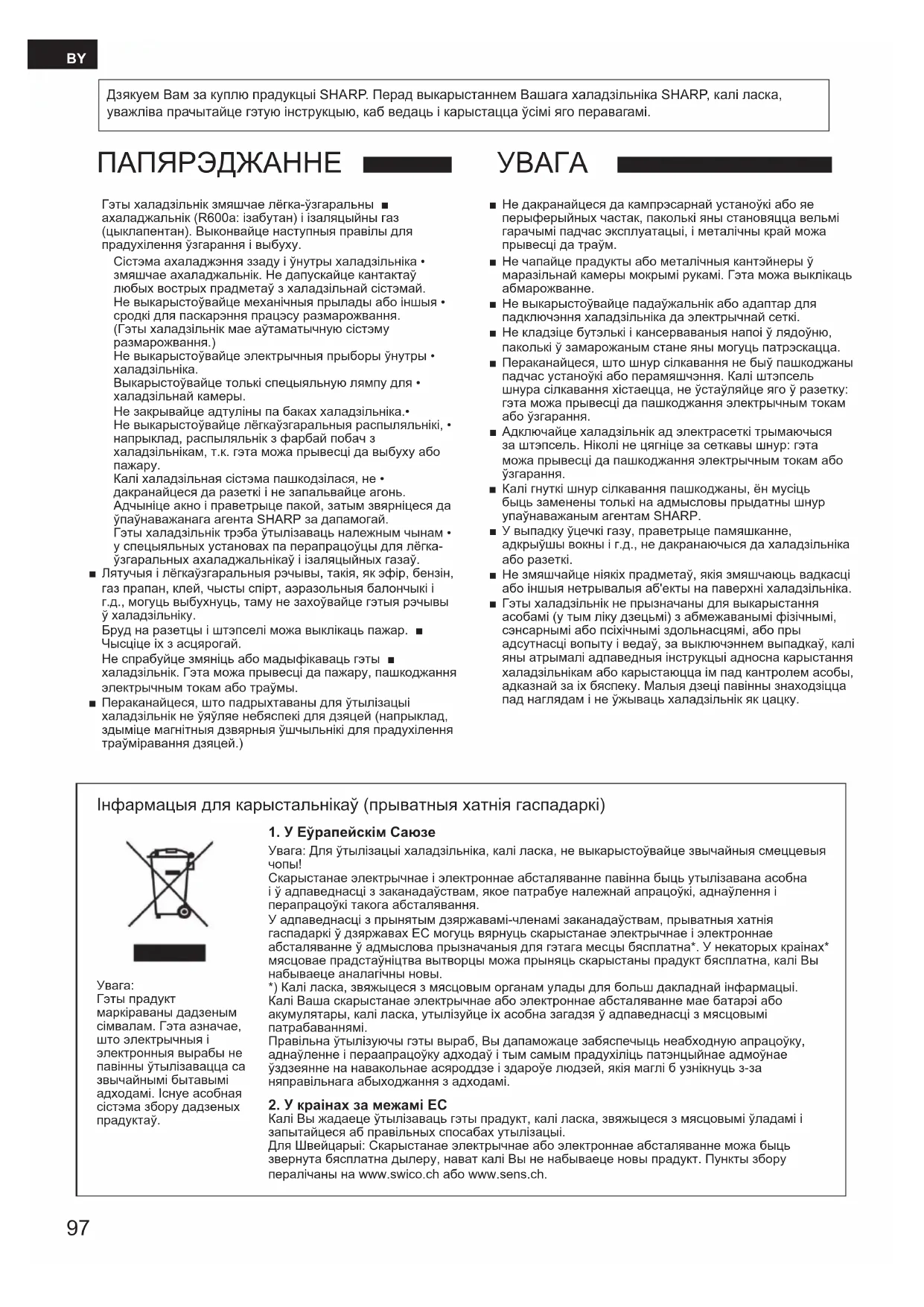 Дзякуем Вам за куплю прадукцыі SHARP. Перад выкарыстаннем Вашага халадзільніка SHARP, калі ласка, уважліва прачытайце гэтую інструкцыю, каб ведаць і карыстацца ўсімі яго перавагамі. Гэты халадзільнік змяшчае лёгка-ўзгаральны ■ахаладжальнік (R600a: ізабутан) і ізаляцыйны газ (цыклапентан). Выконвайце наступныя правілы для прадухілення ўзгарання і выбуху.Сістэма ахаладжэння ззаду і ўнутры халадзільніка • змяшчае ахаладжальнік. Не дапускайце кантактаў любых вострых прадметаў з халадзільнай сістэмай.Не выкарыстоўвайце механічныя прылады або іншыя • сродкі для паскарэння працэсу размарожвання. (Гэты халадзільнік мае аўтаматычную сістэму размарожвання.)Не выкарыстоўвайце электрычныя прыборы ўнутры • халадзільніка.Выкарыстоўвайце толькі спецыяльную лямпу для • халадзільнай камеры.Не закрывайце адтуліны па баках халадзільніка.• Не выкарыстоўвайце лёгкаўзгаральныя распыляльнікі, • напрыклад, распыляльнік з фарбай побач з халадзільнікам, т.к. гэта можа прывесці да выбуху або пажару.Калі халадзільная сістэма пашкодзілася, не • дакранайцеся да разеткі і не запальвайце агонь. Адчыніце акно і праветрыце пакой, затым звярніцеся да ўпаўнаважанага агента SHARP за дапамогай.Гэты халадзільнік трэба ўтылізаваць належным чынам • у спецыяльных установах па перапрацоўцы для лёгка-ўзгаральных ахаладжальнікаў і ізаляцыйных газаў. Лятучыя і лёгкаўзгаральныя рэчывы, такія, як эфір, бензін, ■ газ прапан, клей, чысты спірт, аэразольныя балончыкі і г.д., могуць выбухнуць, таму не захоўвайце гэтыя рэчывы ў халадзільніку.Бруд на разетцы і штэпселі можа выклікаць пажар. ■Чысціце іх з асцярогай.Не спрабуйце змяніць або мадыфікаваць гэты ■халадзільнік. Гэта можа прывесці да пажару, пашкоджання электрычным токам або траўмы. Пераканайцеся, што падрыхтаваны для ўтылізацыі ■ халадзільнік не ўяўляе небяспекі для дзяцей (напрыклад, здыміце магнітныя дзвярныя ўшчыльнікі для прадухілення траўміравання дзяцей.) ПАПЯРЭДЖАННЕ