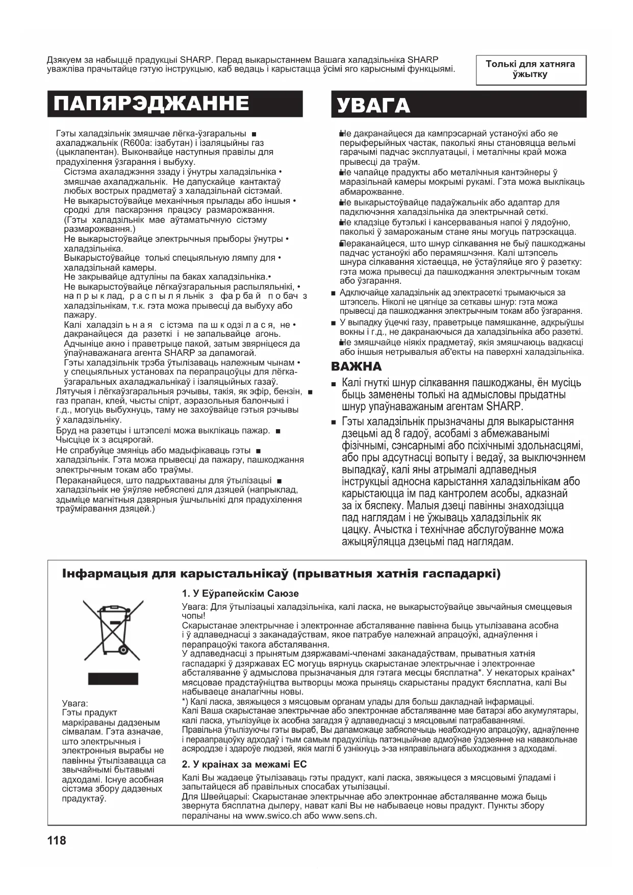 Дзякуем за набыццё прадукцыі SHARP. Перад выкарыстаннем Вашага халадзільніка SHARP