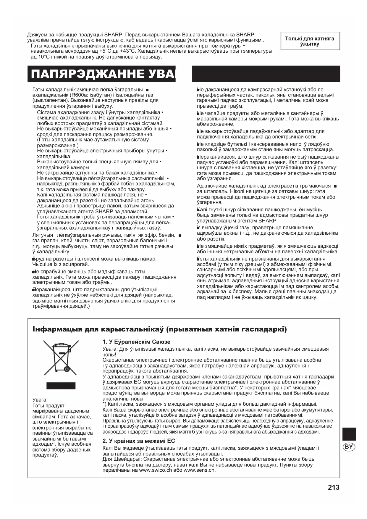 Дзякуем за набыццё прадукцыі SHARP. Перад выкарыстаннем Вашага халадзільніка SHARP