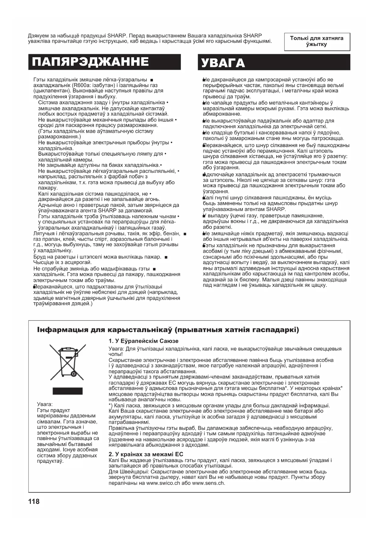 Калі гнуткі шнур сілкавання пашкоджаны, ён мусіць ■ быць заменены толькі на адмысловы прыдатны шнур упаўнаважаным агентам SHARP. У выпадку ўцечкі газу, праветрыце памяшканне, ■ адкрыўшы вокны і г.д., не дакранаючыся да халадзільніка або разеткі. Не змяшчайце ніякіх прадметаў, якія змяшчаюць вадкасці ■ або іншыя нетрывалыя аб'екты на паверхні халадзільніка. Гэты халадзільнік не прызначаны для выкарыстання ■ асобамі (у тым ліку дзецьмі) з абмежаванымі фізічнымі, сэнсарнымі або псіхічнымі здольнасцямі, або пры адсутнасці вопыту і ведаў, за выключэннем выпадкаў, калі яны атрымалі адпаведныя інструкцыі адносна карыстання халадзільнікам або карыстаюцца ім пад кантролем асобы, адказнай за іх бяспеку. Малыя дзеці павінны знаходзіцца пад наглядам і не ўжываць халадзільнік як цацку. Інфармацыя для карыстальнікаў (прыватныя хатнія гаспадаркі)