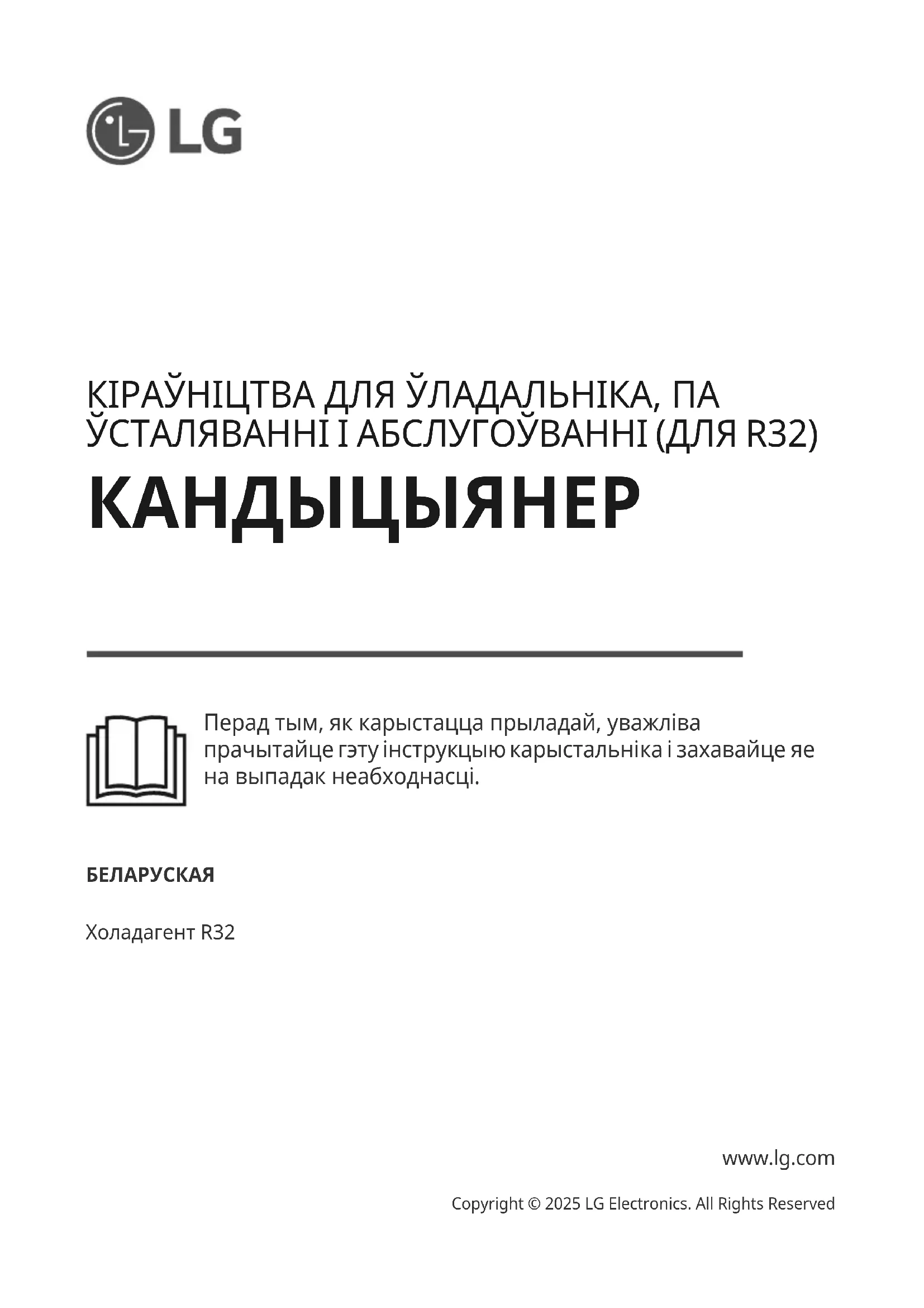 - Холадагент R32 www.lg.com Copyright © 2025 LG Electronics. All Rights ReservedЗМЕСТ Гэтая інструкцыя па эксплуатацыі можа ўтрымліваць малюнкі або тэкст, якія не адносяцца да набытай вамі мадэлі. Вытворца пакідае за сабой права ўносіць змены ў гэту інструкцыю. МЕРЫ БЯСПЕКІ ПЕРАД ВЫКАРЫСТАННЕМ АЗНАЁМЦЕСЯ З УСІМІ ІНСТРУКЦЫЯМІ p. 3