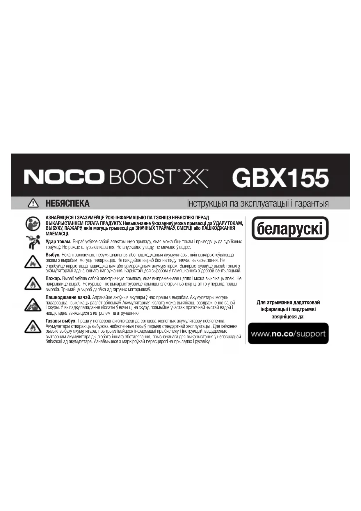 Удар токам. Выраб уяўляе сабой электрычную прыладу, якая можа біць токам і прыводзіць да сур’ёзных траўмаў. Не рэжце шнуры сілкавання. Не апускайце у ваду, не мачыце ў вадзе. Выбух. Некантралюючыя, несумяшчальныя або пашкоджаныя акумулятары, якія выкарыстоўваюцца разам з вырабам, могуць падарвацца. Не пакідайце выраб без нагляду падчас выкарыстання. Не спрабуйце карыстацца пашкоджаным або замарожаным акумулятарам. Выкарыстоўвайце выраб толькі з акамулятарамі адзначаннага напружання. Карыстайцеся вырабам у памяшканнях з добрай вентыляцыяй. Пажар. Выраб уяўляе сабой электрычную прыладу, якая выпраменьвае цяпло і можа выклікаць апёкі. Не накрывайце выраб. Не курыце і не выкарыстоўвайце крыніцы электрычных іскр ці агню ў перыяд працы выраба. Трымайце выраб далёка ад гаручых матэрыялаў. Пашкоджанне вачэй. Апранайце ахоўныя акуляры ў час працы з вырабам. Акумулятары могуць падарвацца і выклікаць разлёт абломкаў. Акумулятарная кіслата можа выклікаць раздражненне вачэй і скуры. У выпадку пападання кіслаты ў вочы ці на скуру, прамыйце ўчастак праточнай чыстай вадой і неадкладна звяжыцеся з катролем па атручванню. Газавы выбух. Праца ў непасрэднай блізкасці да свінцова-кіслотных акумулятараў небяспечна. Акумулятары ствараюць выбухова небяспечныя газы ў перыяд стандартнай эксплуатацыі. Для зніжэння рызыкі выбуху акумулятара, прытрымлівайцеся інфармацыі пра бяспеку і інструкцый, выдадзеных вытворцам акумулятара ды любога іншага абсталявання, прызначанага для выкарыстання ў непасрэднай блізкасці ад акумулятара. Азнаёмьцеся з маркіроўкай перасцярогі на прыладах і рухавіку. Для атрымання дадатковай інфармацыі і падтрымкі звярніцеся да: беларускіBE Асабістая перасцярога. Выкарыстоўвайце прадукт толькі па яго прызначэнні. Хтосьці павінен быць у межах дасягання вашага голасу або досыць блізка, каб прыйсці вам на дапамогу ў выпадку надзвычайнай сітуацыі. Трымайце каля сябе запас чыстай вады і мыла на выпадак атручвання акумулятарнай кіслатой. Насіце акуляры бяспекі і ахоўную адзежу падчас работы каля акумулятара. Заўсёды мыйце рукі пасля працы з акумулятарам і звязаных з ім прылад. У час працы з акумулятарам не апрацоўвайце і не насіце металічныя прадметы, уключаючы інструменты, гадзіннікі або ювелірныя вырабы. Калі метал падае на акумулятар, ён можа выклікаць іскру або кароткае замыканне, што прыводзіць да ўдару электрычным токам, пажару, выбуху, якія, у сваю чаргу, могуць прывесці да траўмаў, смерці або пашкоджання маёмасці. Непаўналетнія. Непаўналетнія. Калі вырабам карыстаюцца непаўналетнія, дарослы «Пакупнік», набыўшы прадукт, павінен падрабязна распавесці пра інструкцыі і папярэджання да пачатку выкарыстання. Невыкананне гэтага правіла з’яўляецца выключнай адказнасцю «Пакупніка», які згаджаецца кампенсаваць NOCO пры любым ненаўмысным ці няправільным выкарыстанні прадукта непаўналетнімі. Праглытання. Аксэсуары могуць уяўляць небяспеку праглытання для дзяцей. Не пакідайце дзяцей без нагляду з вырабам або з любым яго аксэсуарам. Гэты выраб не цацка. Карыстанне. Ас- цярожна карыстайцеся вырабам. Выраб можна пашкодзіць пры ўздзеянні. Не карыстайцеся пашкоджаным вырабам, у тым ліку, але не абмяжоўваючыся, пры расколінах ў корпусе або пашкоджанні кабеляў. Не выкарыстоўвайце прадукт з пашкоджаным шнуром сілкаванн