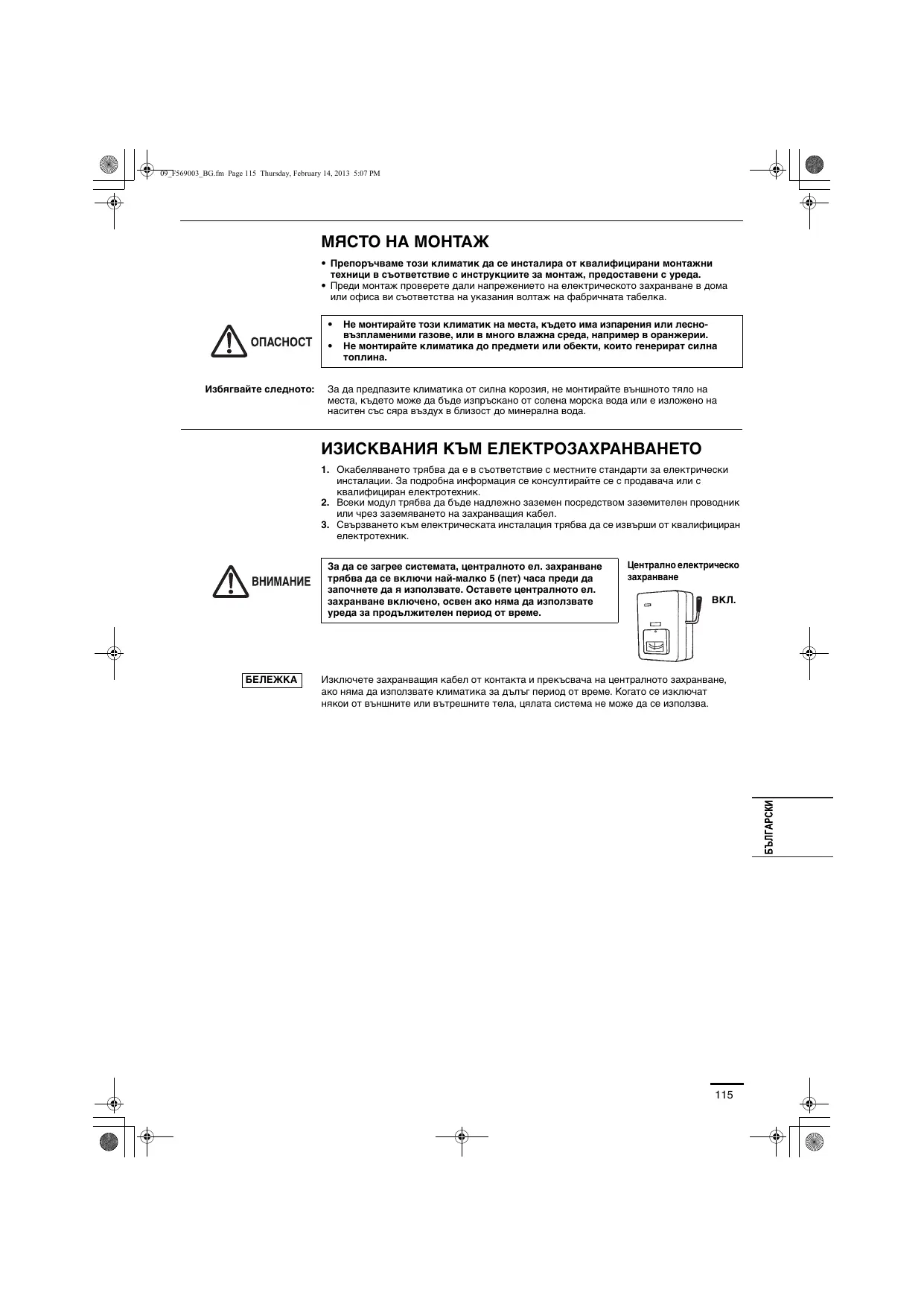 ИЗИСКВАНИЯ КЪМ ЕЛЕКТРОЗАХРАНВАНЕТО 1. Окабеляването трябва да е в съответствие с местните стандарти за електрически инсталации. За подробна информация се консултирайте се с продавача или с квалифициран електротехник. 2. Всеки модул трябва да бъде надлежно заземен посредством заземителен проводник или чрез заземяването на захранващия кабел. 3. Свързването към електрическата инсталация трябва да се извърши от квалифициран електротехник. За да се загрее системата, централното ел. захранване трябва да се включи най-малко 5 (пет) часа преди да започнете да я използвате. Оставете централното ел. захранване включено, освен ако няма да използвате уреда за продължителен период от време.