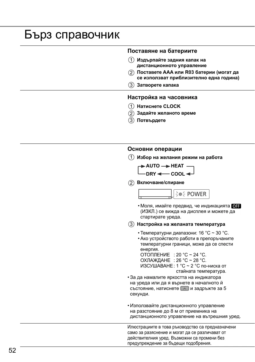 POWER • Моля, имайте предвид, че индикацията (ИЗКЛ.) се вижда на дисплея и можете да стартирате уреда. 3 Настройка на желаната температура • Температурни диапазони: 16 °C ~ 30 °C. • Ако устройството работи в препоръчаните температурни граници, може да се спести енергия. ОТОПЛЕНИЕ : 20 °C ~ 24 °C. ОХЛАЖДАНЕ : 26 °C ~ 28 °C. ИЗСУШАВАНЕ : 1 °C ~ 2 °C по-ниска от стайната температура. • За да намалите яркостта на индикатора на уреда или да я върнете в началното й състояние, натиснете и задръжте за 5 секунди. • Използвайте дистанционното управление на разстояние до 8 м от приемника на дистанционното управление на вътрешния уред. Илюстрациите в това ръководство са предназначени само за разяснение и могат да се различават от действителния уред. Възможни са промени без предупреждение за бъдещи подобрения.