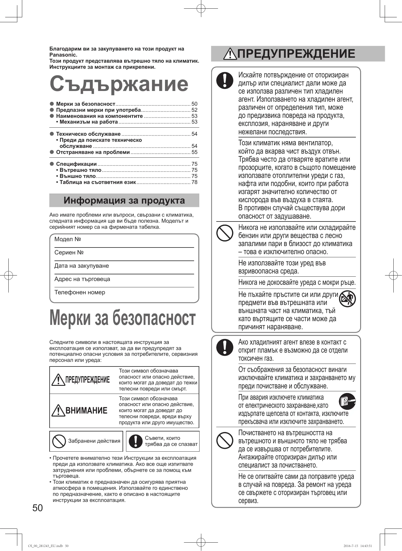 Мерки за безопасност 50 zz Предпазни мерки при употреба 52 zz Наименования на компонентите 53 zz • Механизъм на работа 53 Техническо обслужване 54 zz • Преди да поискате техническо обслужване 54 Отстраняване на проблеми 55 zz Спецификации 75 zz • Вътрешно тяло 75 • Външно тяло 75 • Таблица на съответния език 78