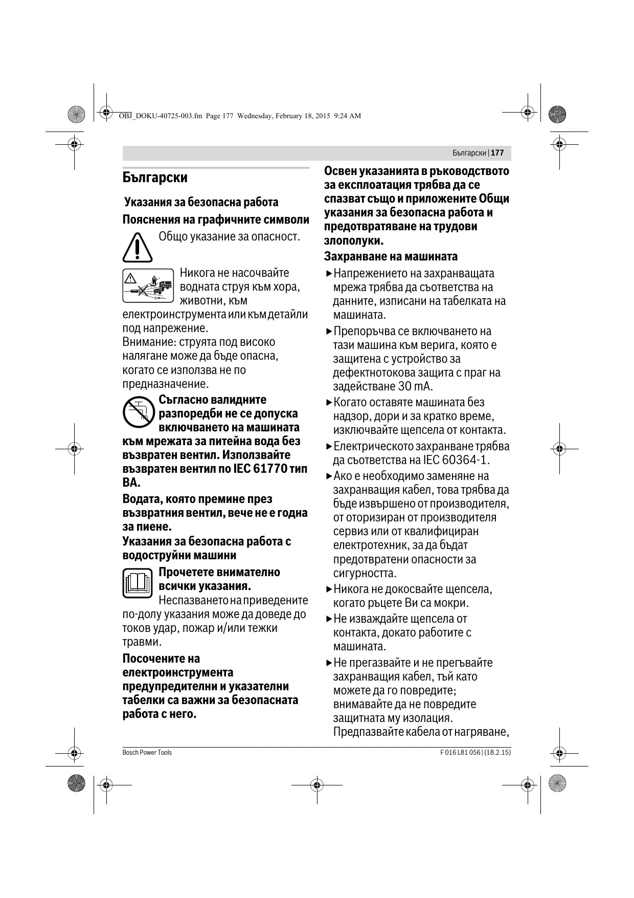 Указания за безопасна работа Пояснения на графичните символи Общо указание за опасност. Никога не насочвайте водната струя към хора, животни, към електроинструмента или към детайли под напрежение. Внимание: струята под високо налягане може да бъде опасна, когато се използва не по предназначение. Съгласно валидните разпоредби не се допуска включването на машината към мрежата за питейна вода без възвратен вентил. Използвайте възвратен вентил по IEC 61770 тип BA. Водата, която премине през възвратния вентил, вече не е годна Указания за безопасна работа с водоструйни машини Прочетете внимателно всички указания. Неспазването на приведените по-долу указания може да доведе до токов удар, пожар и/или тежки Посочените на електроинструмента предупредителни и указателни табелки са важни за безопасната работа с него. Bosch Power Tools Освен указанията в ръководството за експлоатация трябва да се спазват също и приложените Общи указания за безопасна работа и предотвратяване на трудови Захранване на машината Напрежението на захранващата мрежа трябва да съответства на данните, изписани на табелката на Препоръчва се включването на тази машина към верига, която е защитена с устройство за дефектнотокова защита с праг на задействане 30 mA. Когато оставяте машината без надзор, дори и за кратко време, изключвайте щепсела от контакта. Електрическото захранване трябва да съответства на IEC 60364-1. Ако е необходимо заменяне на захранващия кабел, това трябва да бъде извършено от производителя, от оторизиран от производителя сервиз или от квалифициран електротехник, за да бъдат предотвратени опасности за сигурността. Никога не докосвайте щепсела, когато ръцете Ви са мокри. Не изваждайте щепсела от контакта, докато работите с Не прегазвайте и не прегъвайте захранващия кабел, тъй като можете да го повредите; внимавайте да не повредите защитната му изолация. Предпазвайте кабела от нагряване, F 016 L81 056 | (18.2.15) OBJ_DOKU-40725-003.fm Page 178 Wednesday, February 18, 2015 9:24 AM 178 | Български омасляване и допир до остри Не използвайте машината, когато са повредени захранващия кабел или важни звена, като маркучът за високо налягане, пистолетът за пръскане или приспособления за безопасност. Внимание: удължителни кабели, които не съответстват на нормативните изисквания, могат да бъдат опасни. При използване на удължителен кабел щепселът и контактът трябва да са уплътнени срещу проникване на вода. Удължителният кабел трябва да е с напречно сечение на проводниците съгласно указанията в ръководството за експлоатация и да е защитен срещу напръскване с вода. Контактът и щепселът не трябва да са във вода. Когато бъде заменян щепселът на захранващия кабел или на удължителен кабел, трябва да бъдат запазени непропускливостта срещу напръскване с вода и механичната здравина. Подаване на вода Спазвайте изискванията на водоснабдителното дружество. Съединителните звена на всички маркучи трябва да не пропускат Използвайте усилен маркуч с диаметър 12,7 mm (1/2"). Не се допуска машината да бъде включвана към водопровод за питейна вода без възвратен вентил. Водата, която може да протече в F 016 L81 056 | (18.2.15) обратна посока, се счита за негодна Не се допуска маркучът за високо налягане да има повреди (опасност от внезапно пръсване). Повреден маркуч за високо налягане трябва да бъде заменян незабавно. Допуска се използването 
