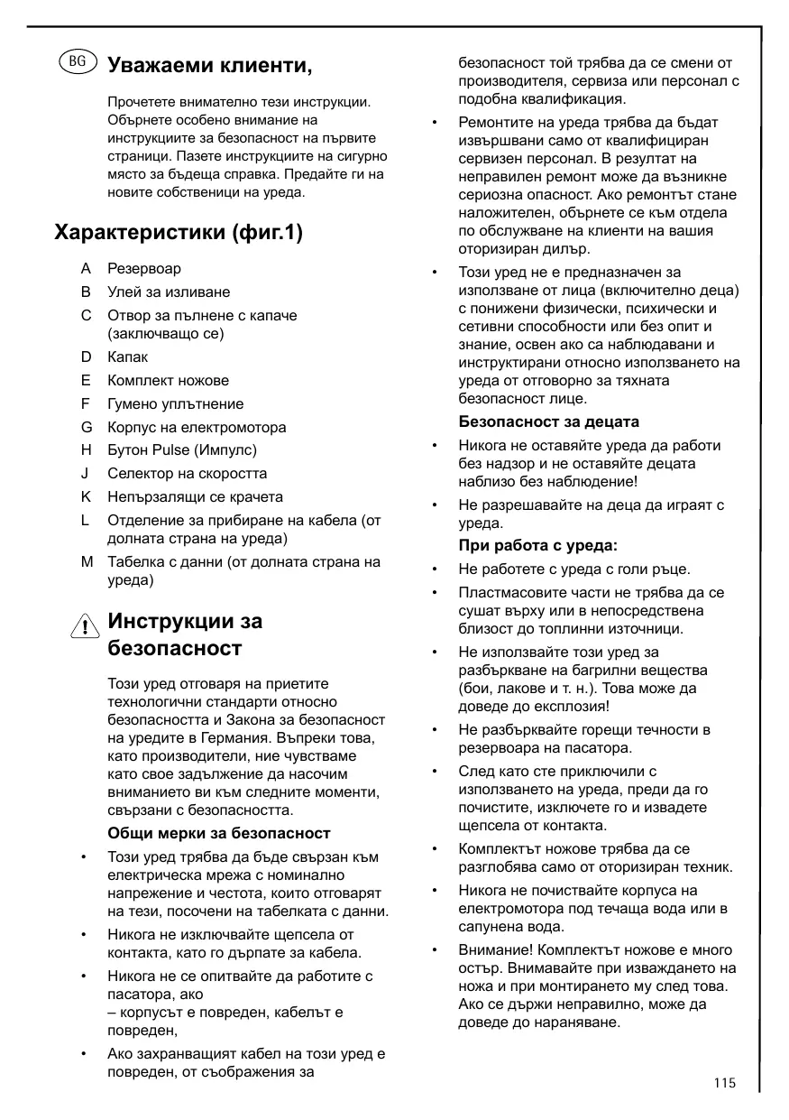 Този уред не е пред на зна чен за използва не от лица (вклю чително д еца ) спониж ени ф изически, психически и сетивни способности или без опит и зна ние, освен а ко са на блю д а ва ни и инструктира ни относно използва нето на уред а от отговорно за тя хна та безопа сност лице. Ха ра ктеристики (ф иг.1)