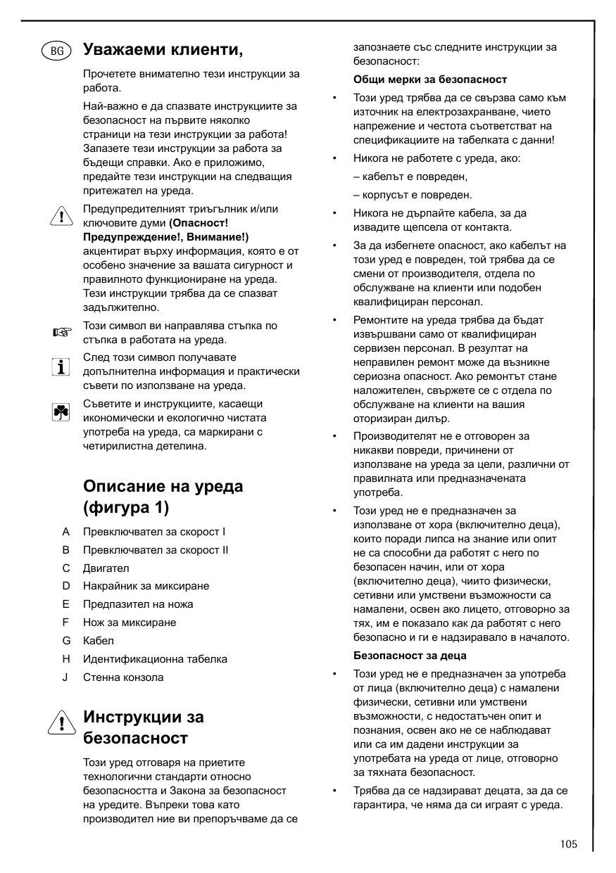 A Commutateur pour vitesse I B Commutateur pour vitesse II C Bloc moteur D Outil mélangeur E Protection lame F Couteau mélangeur G Cordon de branchement H Plaque signalétique J Support mural