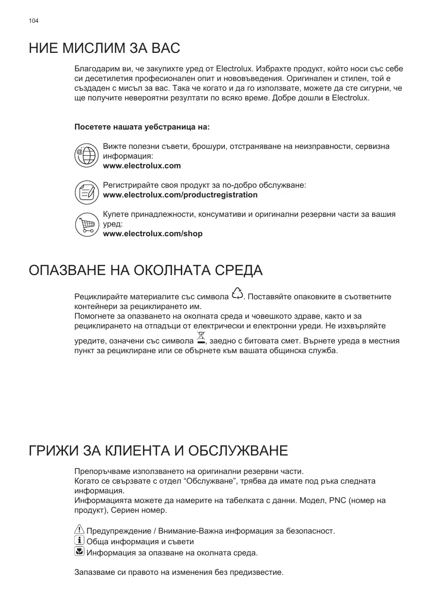 НИЕ МИСЛИМ ЗА ВАС Благодарим ви, че закупихте уред от Electrolux. Избрахте продукт, който носи със себе си десетилетия професионален опит и нововъведения. Оригинален и стилен, той е създаден с мисъл за вас. Така че когато и да го използвате, можете да сте сигурни, че ще получите невероятни резултати по всяко време. Добре дошли в Electrolux. Посетете нашата уебстраница на: Вижте полезни съвети, брошури, отстраняване на неизправности, сервизна информация: www.electrolux.com Регистрирайте своя продукт за по-добро обслужване: www.electrolux.com/productregistration Купете принадлежности, консумативи и оригинални резервни части за вашия уред: www.electrolux.com/shop