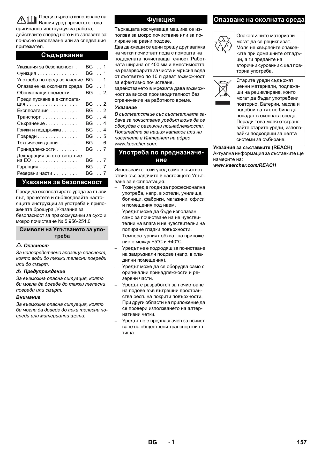 Търкащата изсмукваща машина се използва за мокро почистване или за полиране на равни подове. Два движещи се един срещу друг валяка на четки почистват пода с помощта на подадената почистваща течност. Работната ширина от 400 мм и вместимостта на резервоарите за чиста и мръсна вода от съответно по 10 л дават възможност за ефективно почистване. задействането в мрежата дава възможност за висока производителност без ограничение на работното време. В съответствие със съответната задача за почистване уредът може да се оборудва с различни принадлежности. Попитайте за нашия каталог или ни посетете в Интернет на адрес www.kaercher.com. Употреба по предназначение Използвайте този уред само в съответствие със задачите в настоящото Упътване за експлоатация. – Този уред е годен за професионална употреба, напр. в хотели, училища, болници, фабрики, магазини, офиси и помещения под наем. – Уредът може да бъде използван само за почистване на не чувствителни на влага и не чувствителни на полиране гладки повърхности. Температурният обхват на приложение е между +5°C и +40°C. – Уредът не е подходящ за почистване на замръзнали подове (напр. в хладилни помещения). – Уредът може да се оборудва само с оригинални принадлежности и резервни части. – Уредът е разработен за почистване на подове във вътрешни пространства респ. на покрити повърхности. При други области на приложение да се провери използването на алтернативни четки. – Уредът не е предназначен за почистване на обществени транспортни пътища.