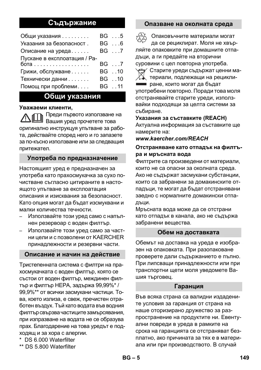 - DS 6.000 Waterfilter ** DS 5.800 Waterfilter Опаковъчните материали могат да се рециклират. Моля не хвърляйте опаковките при домашните отпадъци, а ги предайте на вторични суровини с цел повторна употреба. Старите уреди съдържат ценни материали, подлежащи на рециклиране, които могат да бъдат употребени повторно. Поради това моля отстранявайте старите уреди, използвайки подходящи за целта системи за Указания за съставките (REACH) Актуална информация за съставките ще намерите на: www.kaercher.com/REACH Отстраняване като отпадък на филтъра и мръсната вода Филтрите са произведени от материали, които не са опасни за околната среда. Ако не съдържат засмукани субстанции, които са забранени за домакинските отпадъци, те могат да бъдат отстранявани заедно с нормалните домакински отпадъци. Мръсната вода може да се отстрани като отпадък в канала, ако не съдържа забранени вещества. Обем на доставката Обемът на доставка на уреда е изобразен на опаковката. При разопаковане проверете дали съдържанието е пълно. При липсващи принадлежности или при транспортни щети моля уведомете Вашия търговец.