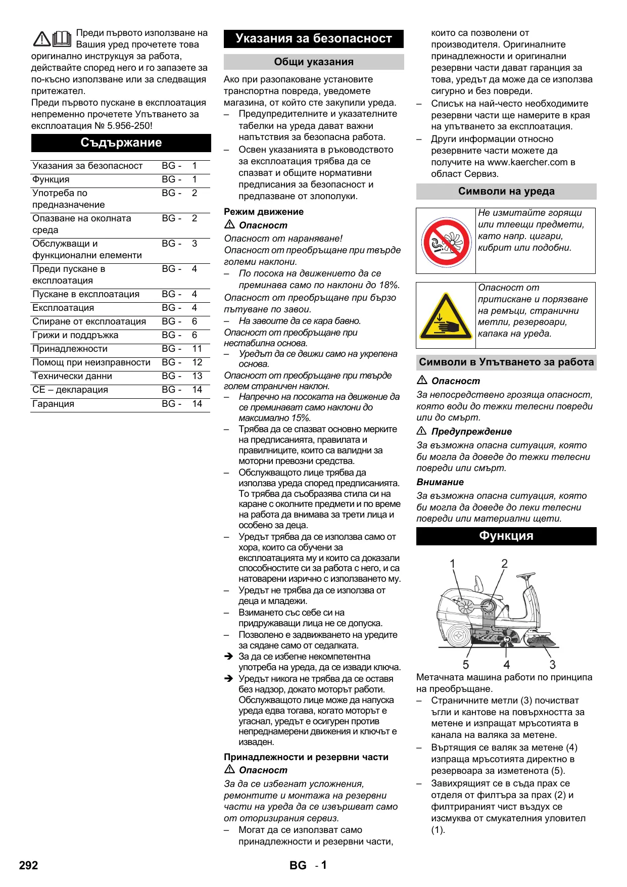 Метачната машина работи по принципа на преобръщане. – Страничните метли (3) почистват ъгли и кантове на повърхността за метене и изпращат мръсотията в канала на валяка за метене. – Въртящия се валяк за метене (4) изпраща мръсотията директно в резервоара за изметенота (5). – Завихрящият се в съда прах се отделя от филтъра за прах (2) и филтрираният чист въздух се изсмуква от смукателния уловител (1). Употреба по предназначение Използвайте тази метачна машина само в съответствие със задачите в настоящото Упътване за експлоатация. Î Уредът с приспособленията за работа преди използване да се провери за безупречно състояние и експлоатационна сигурност. Ако уредът не е в отлично състояние, използването му е забранено. – Тази метачна машина е предназначена за метене на замърсени повърхности вътре и – Уредът не се допуска за движение по обществени улици. – Уредът не е подходящ за изсмукване на застрашаващи здравето прахове. – По уреда не трябва да се предприемат промени. – Никога не измитайте/засмуквайте експлозивни течности, възпламеняеми газове, както и не разредени киселини и разтворители! Към тях принадлежат бензин, разредители за бои или мазут, които при завихряне с въздуха за всмукване могат да образуват експлозивни пари или смеси, освен това ацетон, не разредени киселини и разтворители, тъй като тe атакуват използваните за уреда материали. – Не измитайте/засмуквайте горящи или тлеещи предмети. – Уредът е подходящ само за описаните в Упътването за експлоатация покрития. – Могат да се минава само по повърхности, позволени от предприемача или неговите упълномощени лица за използване на машините. – Забранява се престоя в опасни области. Забранена е работата във взривоопасни помещения. – По принцип важи: Леснозапалимите материали да се държат далече от уреда (Опасност от експлозия/