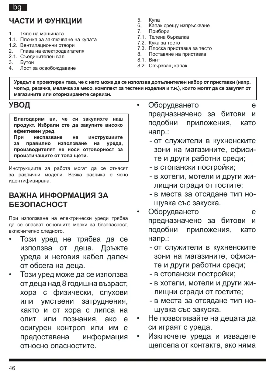 Не използвайте на открито. Не оставяйте кабелът да виси над ръба на масата или брояча или да се допира до горещи повърхности. Пазете ръцете си и приборите от движещите се перки или дискове при обработка на храни, за да избегнете възможността от тежка телесна повреда или повреда на процесора. Може да използвате стръгалка, само когато процесорът за храна не е пълен. За да се избегне нараняване, никога не поставяйте ножът за кълцане или дискът за нарязване/накълцване върху основата, без първо да сте поставили правилно купата. Уверете се, че моторът, дискът и/или ножът за кълцане са спрели напълно, преди да махнете покритието. Преди да започнете да работите с уреда се уверете, че капакът е добре заключен на мястото му. Никога не поставяйте храна в улея за храна с ръка. Винаги използвайте тласкача за храна. Не използвайте този уред при наличие на взривоопасни и/или запалими газове. Не се опитвайте да заменяте механизма за заключване на капака. За да се намали риска от токов удар, не се опитвайте да сваляте долния капак. Вътре няма част, които могат да се сервизират от потребителя. ремонтът трябва да се извършва само от оторизиран персонал. За ваша защита, това устройство е оборудвано с вътрешна система за блокировка, така че процесорът няма да започне да работи, освен ако купата не е заключена към основата, а капакът не е правилно поставен върху основата. Уверете се, че буталото за храна върху капака на купата също е в позиция за заключване. Не се опитвайте да работите с уреда без капака на купата, купата и тласкача за храна да са по местата си. Преди да започнете работа се уверете, че основата е поставена върху равна, суха и чиста повърхност. ПРЕДИ ПЪРВА УПОТРЕБА преди да използвате уреда за първи път, измийте плоската бъркалка, куката за тесто и стоманената купа с топла вода и препарат. Изплакнете и Измийте на ръка телената бъркалка.