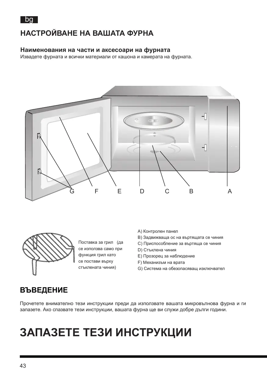 А) Контролен панел B) Задвижваща ос на въртящата се чиния C) Приспособление за въртяща се чиния D) Стъклена чиния E) Прозорец за наблюдение F) Механизъм на врата G) Система на обезопасяващ изключвател