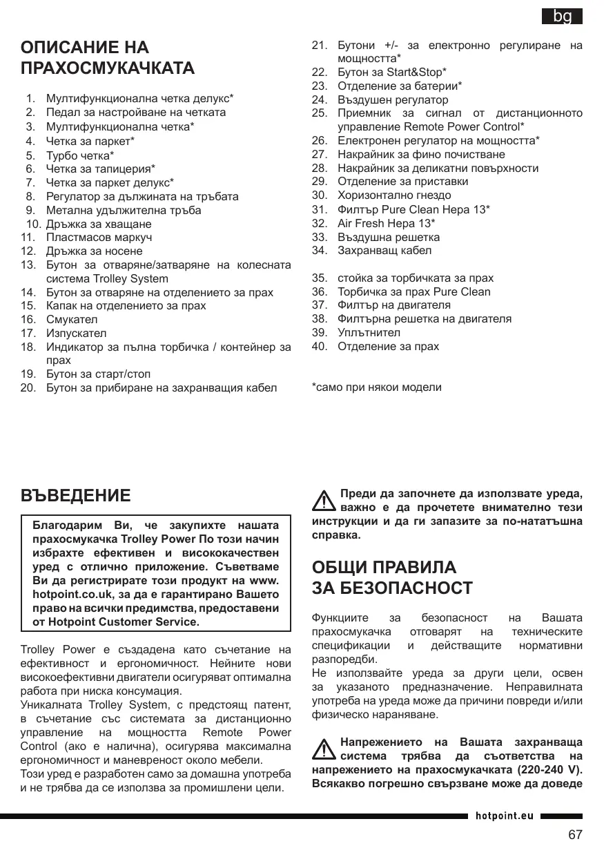 Благодарим Ви, че закупихте нашата прахосмукачка Trolley Power По този начин избрахте ефективен и висококачествен уред с отлично приложение. Съветваме Ви да регистрирате този продукт на www. hotpoint.co.uk, за да е гарантирано Вашето право на всички предимства, предоставени от Hotpoint Customer Service. Trolley Power е създадена като съчетание на ефективност и ергономичност. Нейните нови високоефективни двигатели осигуряват оптимална работа при ниска консумация. Уникалната Trolley System, с предстоящ патент, в съчетание със системата за дистанционно управление на мощността Remote Power Control (ако е налична), осигурява максимална ергономичност и маневреност около мебели. Този уред е разработен само за домашна употреба и не трябва да се използва за промишлени цели.