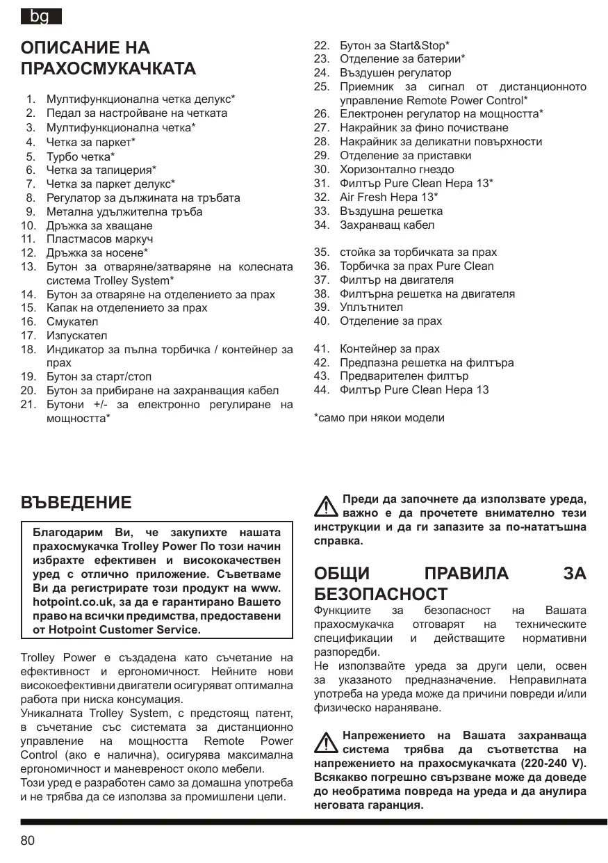 Благодарим Ви, че закупихте нашата прахосмукачка Trolley Power По този начин избрахте ефективен и висококачествен уред с отлично приложение. Съветваме Ви да регистрирате този продукт на www. hotpoint.co.uk, за да е гарантирано Вашето право на всички предимства, предоставени от Hotpoint Customer Service. Trolley Power е създадена като съчетание на ефективност и ергономичност. Нейните нови високоефективни двигатели осигуряват оптимална работа при ниска консумация. Уникалната Trolley System, с предстоящ патент, в съчетание със системата за дистанционно управление на мощността Remote Power Control (ако е налична), осигурява максимална ергономичност и маневреност около мебели. Този уред е разработен само за домашна употреба и не трябва да се използва за промишлени цели.