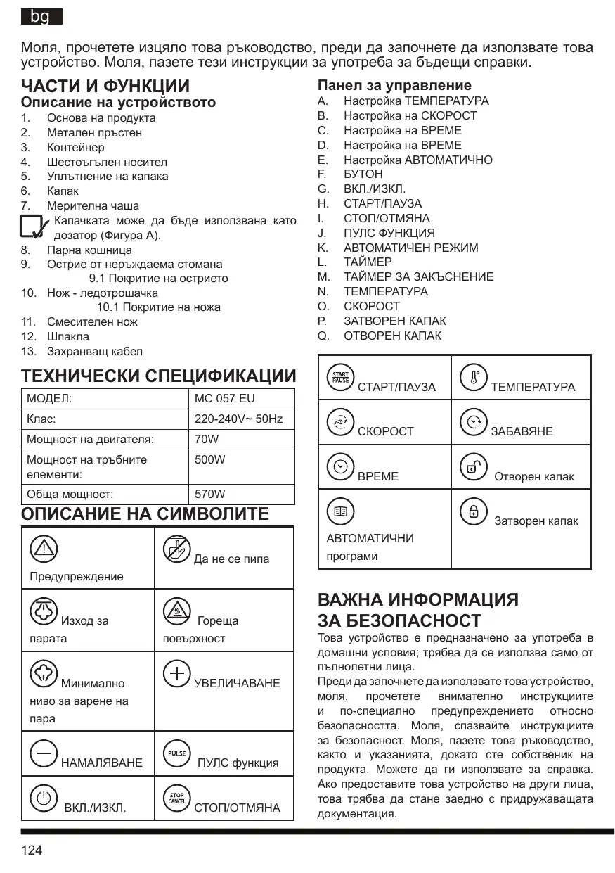 център. Моля, НЕ използвайте устройството с голи или мокри ръце и крака. Моля, НЕ издърпвайте захранващия кабел на устройството, за да го изключите от контакта. Моля, не поставяйте захранващия кабел върху ъгли или остри ръбове: може да се повреди. Не потапяйте корпуса на двигателя във вода; Никога не го поставяйте под течаща вода. Моля, избършете внимателно контактите на контейнера, които се намират в долната част, преди да го поставите обратно на мястото му. Моля, проверявайте периодично целостта на уплътнението на шестоъгълната вложка, както и на конектора на контейнера. Ако са износени, моля, свържете се с оторизиран сервизен център. Внимание! ОПАСНОСТ ОТ ПОЖАР Устройството не трябва да се използва под или в близост до запалими материали, като например завеси. Поставете устройството далеч от чувствителни към топлина повърхности. Оставете устройството да изстине, преди да го поставите обратно. Моля, не използвайте удължители или разклонители. Моля пъхнете изцяло захранващия кабел на предвиденото за целта място. Развийте изцяло захранващия кабел, преди да свържете устройството към контакта. Масла и нагрети мазнини са лесно запалими. Внимание! ОПАСНОСТ ОТ ИЗГАРЯНИЯ НИКОГА не превишавайте максималното ниво от 1,5 L, показано на контейнера, за да избегнете препълване с гореща вода и храна. НИКОГА не използвайте устройството без дозаторна капачка в капака при импулсна функция или скорост по-високи от 5, защото горещите части могат да бъдат залети върху потребителя или околната среда. Никога не използвайте смесителния нож с импулсна функция или скорост по-високи от 5. Когато устройството работи, неговите повърхности могат да достигнат много високи температури; Моля, винаги използвайте фурната с подходящи ръкавици, за да боравите с контейнера, капака, смесителния нож, назъбения нож на ледотрошачката, ножа от неръждаема