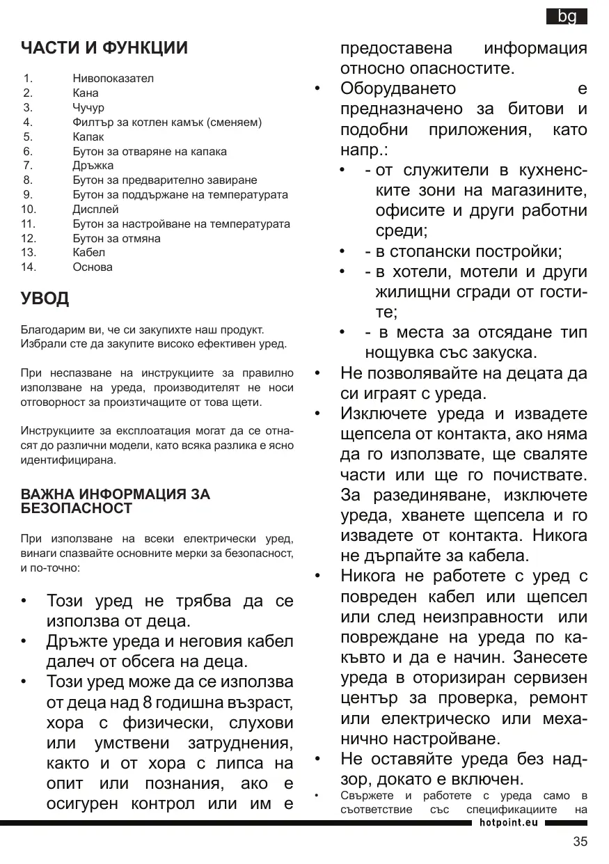 Преди да използвате уреда прочетете всички инструкции. Не оставяйте кабелът да виси над ръба на масата или брояча или да се допира до горещи повърхности. Никога не поставяйте уреда върху или близо до газова или електрическа горелка, или в загрята фурна. Не използвайте уреда празен, за да избегнете повреждане на нагревателните елементи. Уверете се, че каната се използва върху твърда и равна повърхност, далеч от достъпа на деца. Това ще предпази каната от преобръщане и причиняване на щети или наранявания. Като защита срещу пожар, токови удари или телесни повреди, не потапяйте кабела, щепсела или уреда във вода или други Докато водата ври или след като заври, избягвайте всякакъв контакт с парата. Старайте се да изливате врялата вода бавно и внимателно, без да накланяте твърде бързо Бъдете внимателни, когато пълните гореща Основата трябва да се използва само по предназначение. Трябва да сте изключително внимателни, когато премествате уред с гореща вода. Използването на приставки, които не са одобрени или не са закупени от производителя, могат да предизвикат пожар, токов удар или телесна повреда. Изключете каната от контакта, ако няма да го използвате, и преди почистване. Оставете каната да се охлади, преди да монтирате / демонтирате която и да е част, и преди почистване. Уредът е оборудван със заземен щепсел. Уверете се, че контактът на стената в дома ви е правилно заземен. Използвайте уреда само и единствено по предназначение. Този уред не е предназначен за употреба от лица (включително деца) с намалени физически, сетивни или умствени способности или липса на опит и познания, освен ако не са надзиравани или инструктирани за употребата ум от лице, отговорно за тяхната безопасност. Винаги се уверявайте, че уредът е в добро работно състояние и че всички подвижни