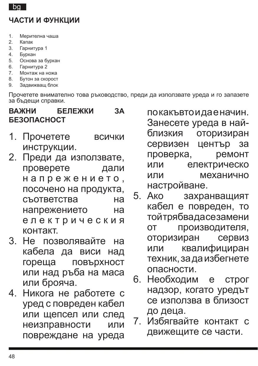 12.Ne laissez jamais l’appareil sans surveillance. 13.Lorsque vous retirez le mixeur du moteur, attendez que les lames cessent complètement de tourner. 14.Mettez toujours le mixeur en marche avec le couvercle bien fermé. 15.Utilisez toujours l’appareil sur une surface sécurisée, sèche et plane. 16.Ne placez jamais l’appareil sur ou près d’une plaque à gaz ou électrique chaude, où il serait en contact avec des appareils chauds. 17.Ne pas l’utiliser à l’extérieur. 18.Ne pas utiliser l’appareil pour un usage autre que celui prévu. 19.Faire attention aux
