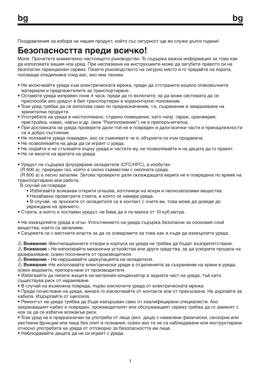 Безопасността преди всичко! Моля, Прочетете внимателно настоящото ръководство. То съдържа важна информация за това как да използвате вашия нов уред. При неспазване на инструкциите може да загубите правото си на безплатен гаранционен сервиз. Пазете ръководството на сигурно място и го предайте на хората, ползващи хладилника след вас, ако има такива. • Не включвайте уреда към електрическата мрежа, преди да отстраните изцяло опаковъчните материали и предпазителите за транспортиране. • Оставете уреда изправен поне 4 часа, преди да го включите, за да може системата да се приспособи ако уредът е бил транспортиран в хоризонтално положение. • Този уред трябва да се използва само по предназначение, т.е. съхранение и замразяване на хранителни продукти. • Употребата на уреда в неотоплявано, студено помещение, като напр. гараж, оранжерия, пристройка, навес, навън и др. (виж “Разположение”) не е препоръчителна. • При доставката на уреда проверете дали той не е повреден и дали всички части и принадлежности са в добро състояние. • Не ползвайте уреда повреден, ако се съмнявате че е, обърнете се към продавача. • Не позволявайте на деца да си играят с уреда. • Не сядайте и не стъпвайте върху уреда и частите му, не позволявайте и на децата да го правят. • Не се весете на вратата на уреда. • Уредът не съдържа флуорирани охладители (CFC/HFC), а изобутан (R 600 a), природен газ, който е силно съвместим с околната среда. (R 600 a) е лесно запалим. Затова проверете дали охлаждащата верига не е повредена по време на транспортиране или работа. В случай на повреда: • Избягвайте всякакви открити огньове, източници на искри и леснозапалими вещества. • Незабавно проветрете стаята, в която се намира уреда. • В случай, че пръските от охладителя са в контакт с очите ви, това може да доведе до увреждане на зрението. • Стаята, в която е поставен уредът, не бива да е по-малка от 10 куб.метра. • Не изхвърляйте уреда в огън. Уплътнението на уреда съдържа безопасни за озоновия слой вещества, които са запалими. • Свържете се с местните власти за да се осведомите за това как и къде да изхвърлите уреда. A Внимание -Вентилационните отвори в корпуса на уреда не трябва да бъдат възпрепятствани. A Внимание - Не използвайте механични устройства или други средства, за да ускорите процеса на размразяване, освен посочените от производителя. A Внимание - Не нарушавайте циркулацията на охладителя. A Внимание -Не използвайте електрически уреди в отделенията за съхранение на храни в уреда, освен видовете, препоръчани от производителя. • Избягвайте да пипате жиците на металния кондензатор в задната част на уреда, тъй като съществува риск от нараняване. • В случай на възможна повреда, първо изключете уреда от електрическата мрежа. • Преди почистване на уреда, винаги го изключвайте от контакта или от прекъсвача. Не дърпайте за кабела. Издърпайте от щепсела. • Ремонтът на уреда трябва да бъде извършван само от квалифицирани специалисти. Ако захранващият кабел е повреден, производителят или обслужващият сервиз трябва да го заменят с нов за да се избегне всякакъв риск. • Този уред не е предназначен за употреба от лица (вкл. деца) с намалени физически, сензорни или умствени функции или лица без опит и познания, освен ако те не са наблюдавани или инструктирани относно употребата на уреда от отговорно за безопас