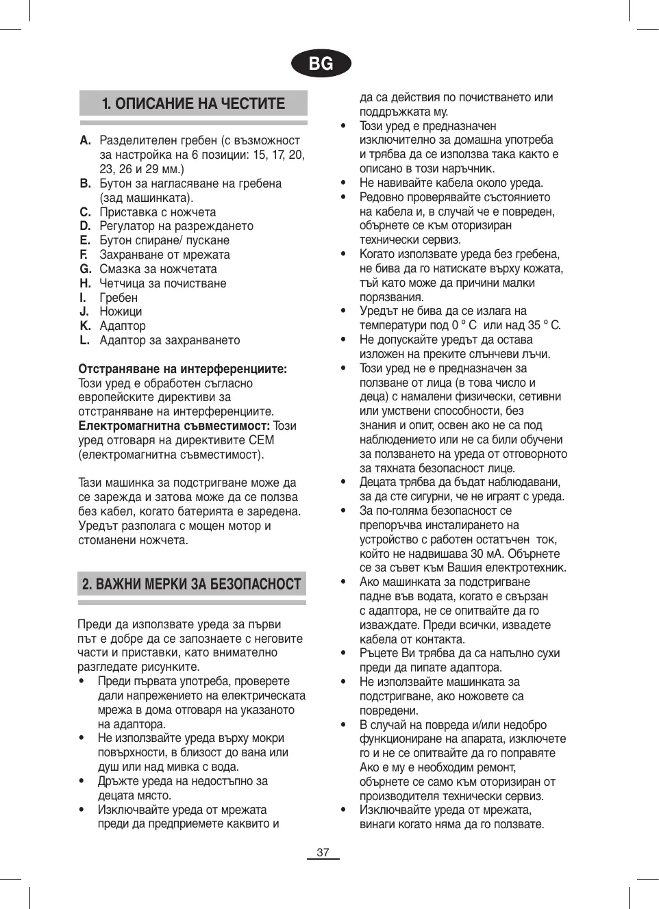 • Vérifiez périodiquement l’état du cordon. S’il est endommagé, adressezvous à un Service Technique agréé. Si vous utilisez la tondeuse sans le peigne, ne la frottez pas sur la peau, pour éviter de vous couper. Ne pas exposer l’appareil à une température inférieure à 0º C, ni supérieure à 35º C. Veillez à le garder toujours à l’abri des rayons directs du soleil. Cet appareil n’est pas destiné à être utilisé par des personnes (enfants y compris) souffrant d’un handicap physique, sensoriel ou mental, ni celles manquant d’expérience ou ignorant son fonctionnement, sauf si des instructions appropriées leur ont été données et sous la surveillance d’une personne responsable de leur sécurité. Ne laissez pas jouer les enfants avec l’appareil. Pour une plus grande protection, il est recommandé d’installer un disjoncteur différentiel à courant résiduel à haute sensibilité (RCD) de 30mA. Consultez votre installateur. Si la tondeuse en marche venait à se mouiller, ne tentez pas de la sécher. Débranchez aussitôt l’appareil de la prise de courant. Ne jamais toucher l’adaptateur avec les mains mouillées. Ne jamais utiliser la tondeuse si les lames de coupe sont endommagées. En cas de panne ou de défaillance de fonctionnement débranchez l’appareil et n’essayez pas de le réparer vousmême. Adressez-vous toujours, pour le réparer, à un Service d’Assistance Technique agréé par le fabriquant. Débranchez l’appareil lorsque vous ne l’utilisez pas. L’adaptateur de la tondeuse à cheveux sert à recharger la batterie de l’appareil. Vous pouvez vous coupez les cheveux