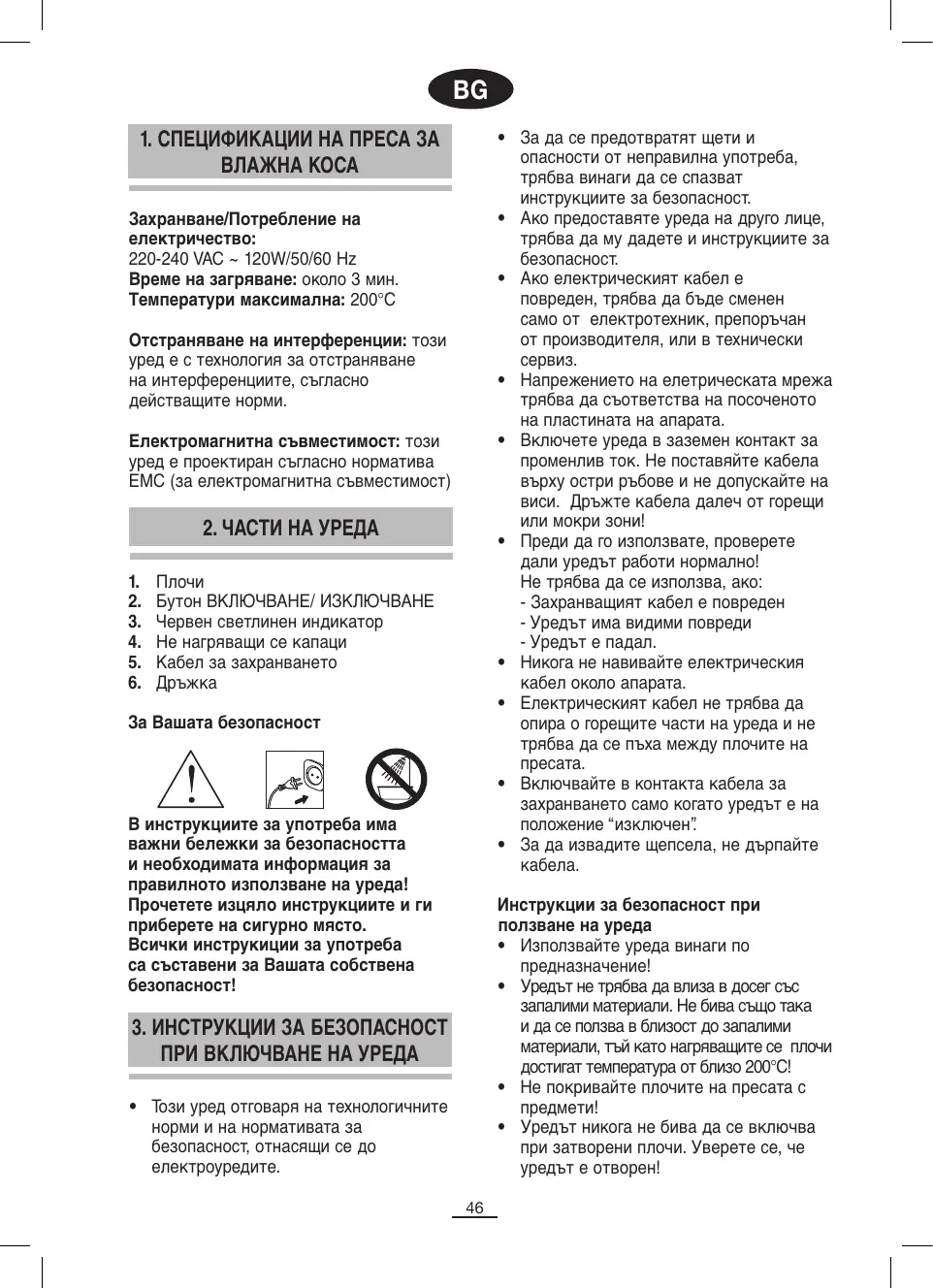Захранване/Потребление на електричество: 220-240 VAC ~ 120W/50/60 Hz Време на загряване: около 3 мин. Tемператури максимална: 200°C Отстраняване на интерференции: този уред е с технология за отстраняване на интерференциите, съгласно действащите норми. Електромагнитна съвместимост: този уред е проектиран съгласно норматива EMC (за електромагнитна съвместимост)