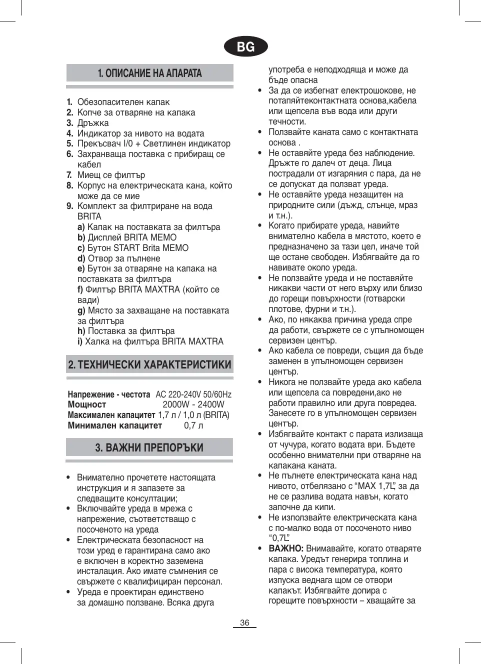 НА ВАШАТА КАНА Преди да ползвате за първи път или ако не сте ползвали дълго време, напълнете каната до максимум, сварете я и тогава изхвърлете водата. Уверете се също така, че следвате напълно указанията за ползване на филтъра BRITA MAXTRA, които ще намерите в раздел 5.2 на наръчника.