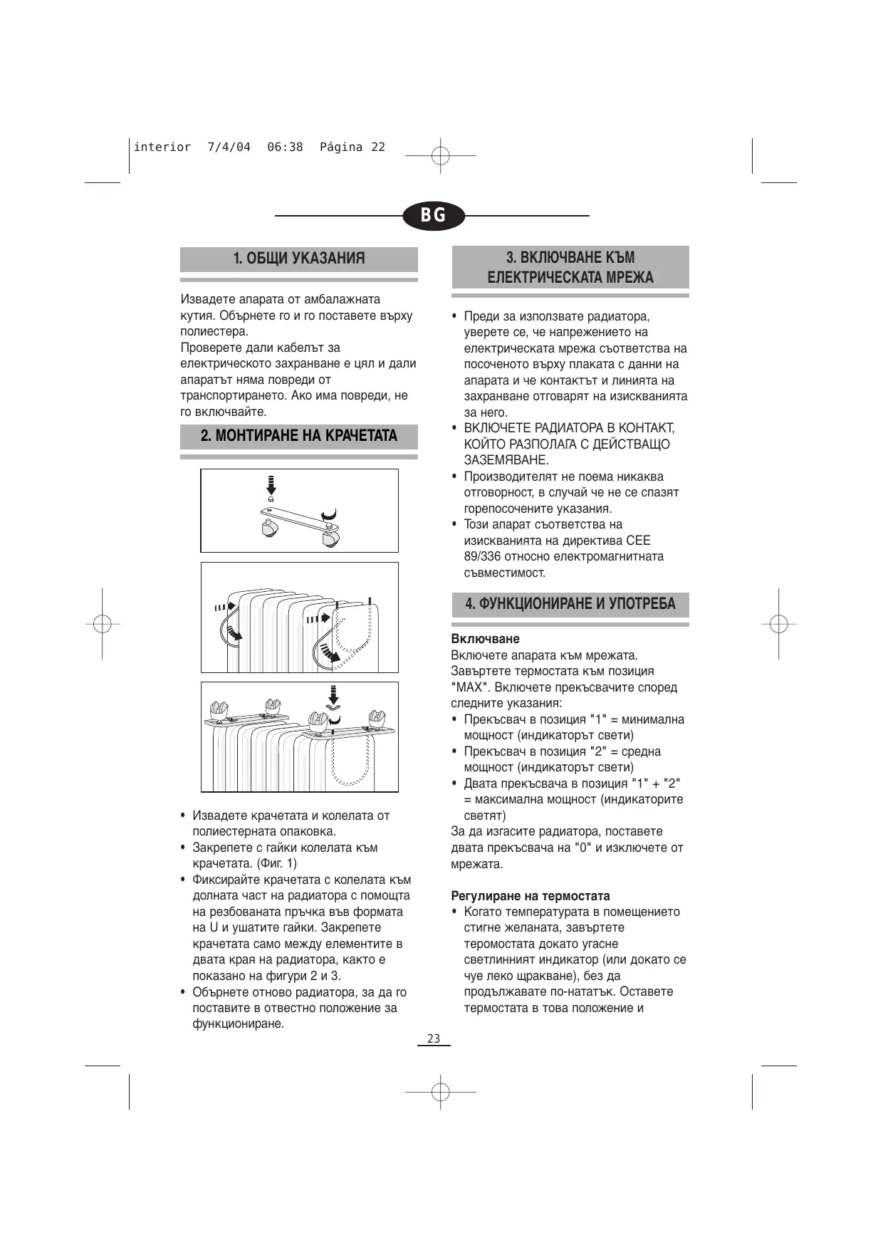 трябва да се извърши само от производителя или неговия технически сервиз. В случай на изтичане на масло следва да се уведоми производителя или неговия Не използвайте този апарат в помещения с площ по-малка от 4m2. Защитно устройство преустановява функционирането на радиатора в случай на инцидентно прегряване. За да го включите отново, обърнете се към оторизиран от производителя технически сервиз. Унищожаване на апарата: Когато решите да изхвърлите апарата, занесете го в местния център за унищожаване на твърди отпадъци. Следвайте действащите разпоредби относно унищожаването на масла. За да получите информация за найблизкия център за рециклиране, направете справка във вашето кметство или общинското управление. ВАЖНО: В никакъв случай не покривайте апарата, когато работи, тъй като това ще предизвика опасното му прегряване. interior 7/4/04 06:38 Página 24