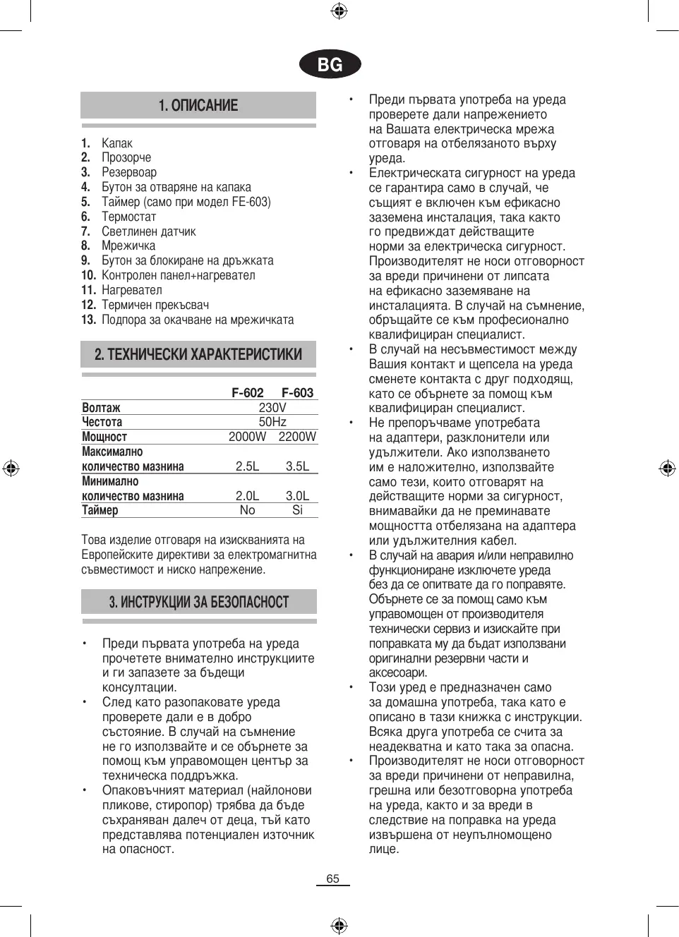 • Antes de utilizar el aparato por primera vez, lea todas las instrucciones y guárdelas para posteriores consultas. • Después de haber quitado el embalaje, cerciórese de la integridad del producto. Si tuviera dudas, no utilice el aparato y diríjase a un Centro de Asistencia Técnico autorizado. • Los elementos del embalaje (bolsas de plástico, espuma de poliestireno, etc.), no deben dejarse al alcance de los niños, porque puede representar un peligro. • Antes de la primera utilización, compruebe que el voltaje de su red doméstica coincide con el indicado sobre el aparato. 1 • A la hora de seleccionar la temperatura guíese por la información del envase del alimento a freír o por la tabla orientativa que aparece en la freidora. • Cuando el indicador luminoso se apague (10-15 minutos), el aceite/grasa, habrá adquirido la temperatura seleccionada. El indicador luminoso seguirá apagándose y encendiéndose con los ciclos del termostato durante todo el tiempo de fritura. • Si desea hacer varias frituras seguidas, antes de empezar a freír la siguiente porción de alimento, se debe esperar hasta que el indicador luminoso se apague. • Pulse el botón de apertura de la tapa (4) e introduzca el cestillo (8) con los alimentos en aceite o grasa lentamente, colgando en el soporte fijación cestillo (13). • Cierre la Tapa (1) pulse el Botón (9) para abatir el Asa cestillo a su posición de reposo, para evitar quemaduras. • Vigile el proceso de fritura. Tapa de la Freidora cerrada al objeto de evitar quemaduras. Este aparato va provisto de un microinterruptor que impide el funcionamiento de la freidora si la unidad de resistencia no está montada correctamente.