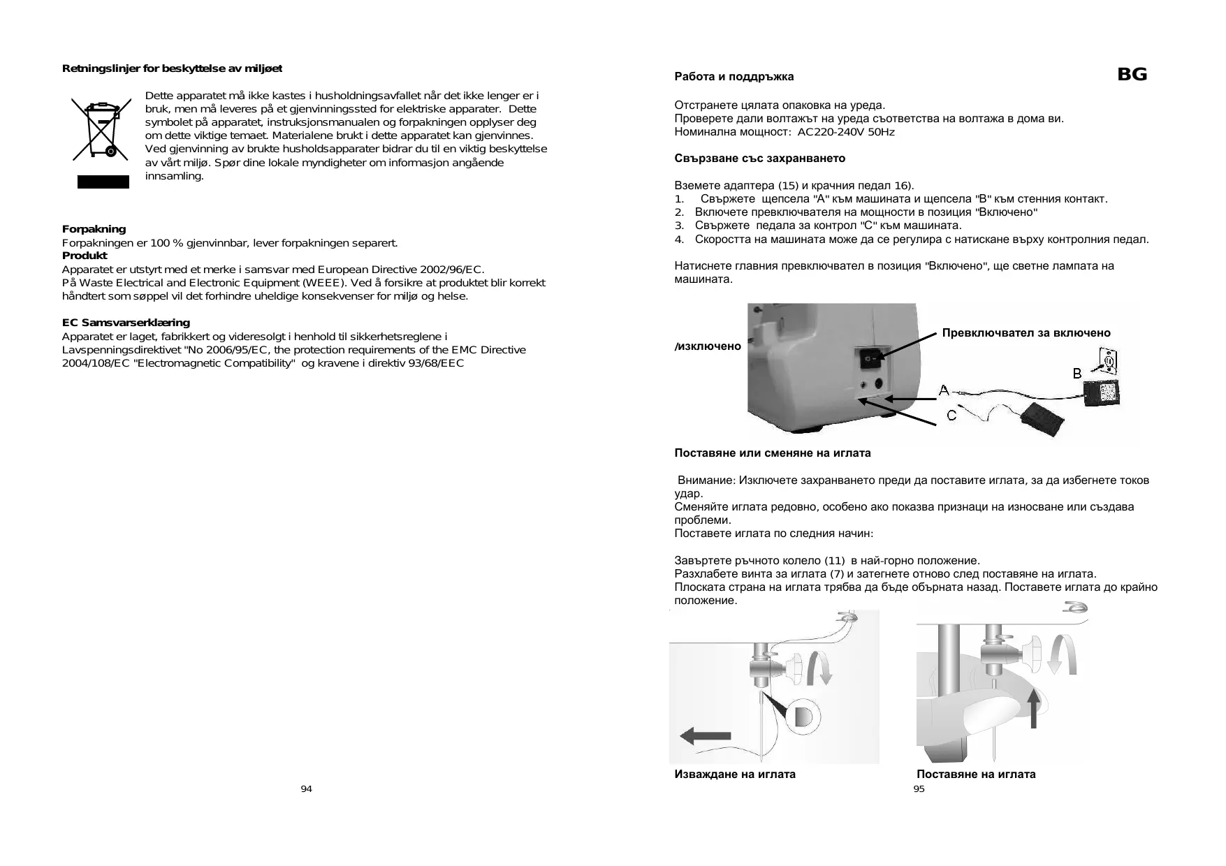 Отстранете цялата опаковка на уреда. Проверете дали волтажът на уреда съответства на волтажа в дома ви. Номинална мощност: AC220-240V 50Hz Свързване със захранването Вземете адаптера (15) и крачния педал 16). 1. Свържете щепсела "А" към машината и щепсела "В" към стенния контакт. 2. Включете превключвателя на мощности в позиция "Включено" 3. Свържете педала за контрол "С" към машината. 4. Скоростта на машината може да се регулира с натискане върху контролния педал. Натиснете главния превключвател в позиция "Включено", ще светне лампата на машината.